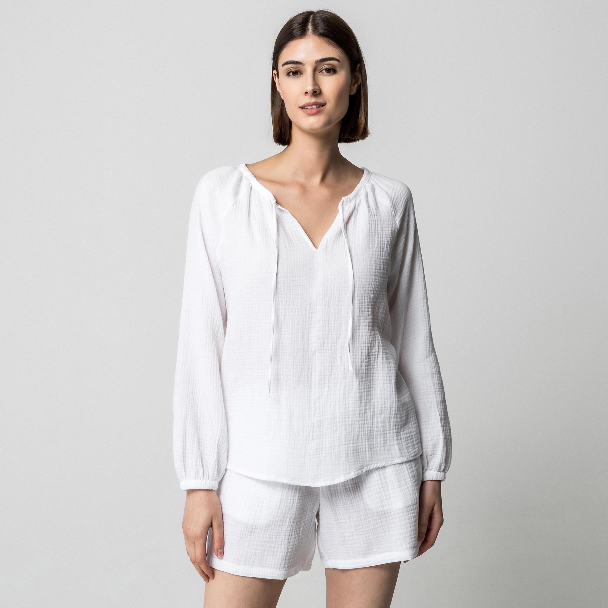 Questa camicetta è realizzata in puro cotone. Il taglio informale e la vestibilità casual in mussola creano uno stile di carattere. La camicetta ha una scollatura rotonda regolabile da annodare, maniche lunghe con polsini e orlo dritto.