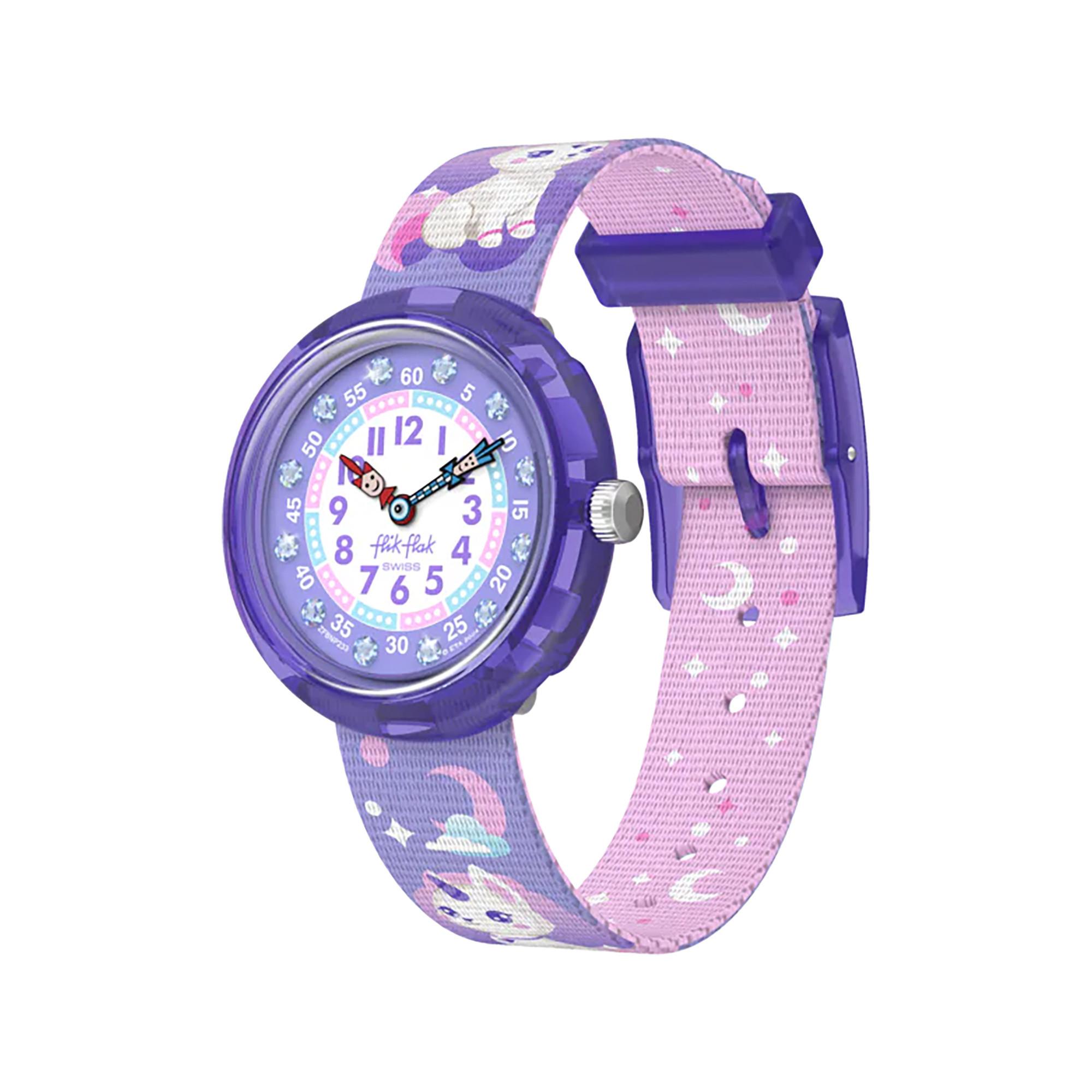 L'affascinante orologio per bambini COSMICAT mostra un gattino unicorno nel mezzo di un cielo viola da sogno, circondato da nuvole di zucchero filato. È decorato con pietre di cristallo e rende il tempo di studio un piacere magico. .