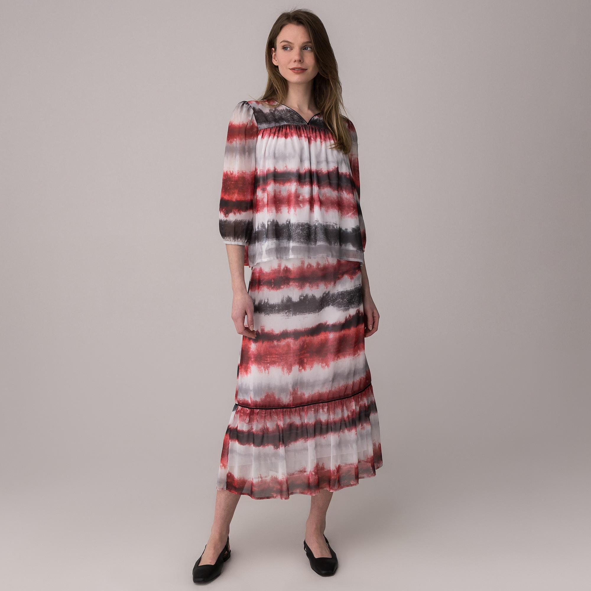 La camicetta è un capo comodo dalla vestibilità ampia. Le arricciature sopra il petto donano una silhouette giocosa, mentre lo scollo a V e i polsini elastici sono ulteriori dettagli di stile.