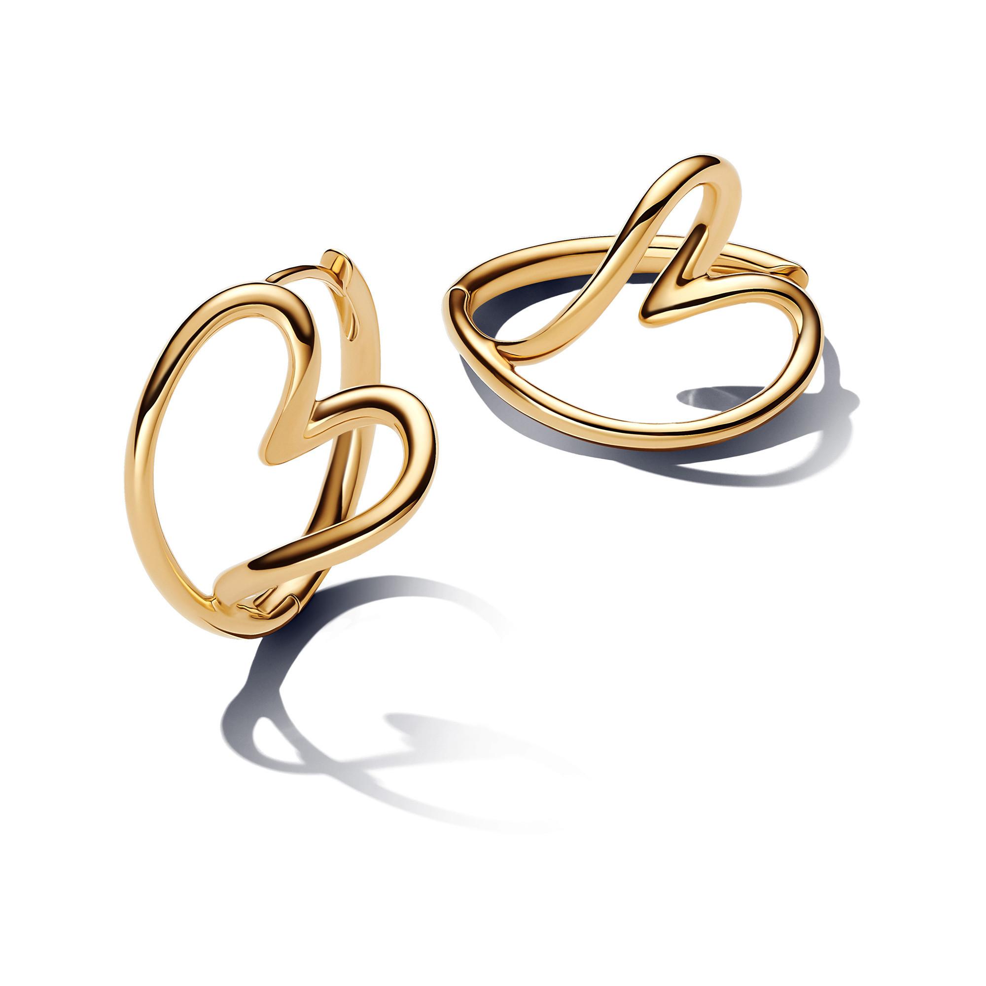L'amore è nella tua natura. Questi orecchini a cerchio dalla forma organica hanno la forma di cuori astratti aperti con placcatura in oro, ispirati alle forme fluide della natura. Gli orecchini sono venduti come una coppia speculare. Una semplice chiusura a scatto li rende facili da indossare. Da abbinare al braccialetto e all'anello coordinati per un'interpretazione moderna di un simbolo duraturo dell'amore.