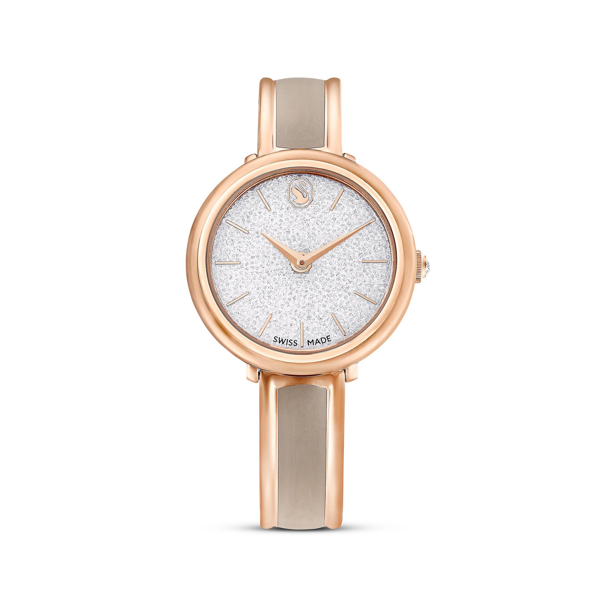 Questo orologio Crystalline Bangle di Swarovski unisce gioiello e orologio con un design Swiss Made. La cassa in acciaio inossidabile con finitura oro rosa include circa 1.016 cristalli sul quadrante e un bracciale regolabile con dettaglio in smalto.