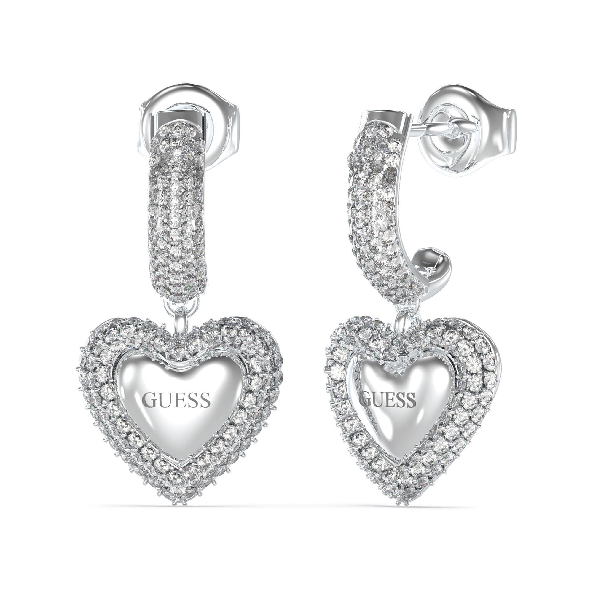 "Gli orecchini a cerchio in acciaio inossidabile Guess ""Beloved"" da donna in argento combinano uno stile intramontabile con dettagli moderni. Elementi a forma di cuore e zirconi scintillanti donano un tocco romantico e una lucentezza radiosa. Realizzati in acciaio inossidabile di alta qualità, offrono durata e comfort ottimale. "