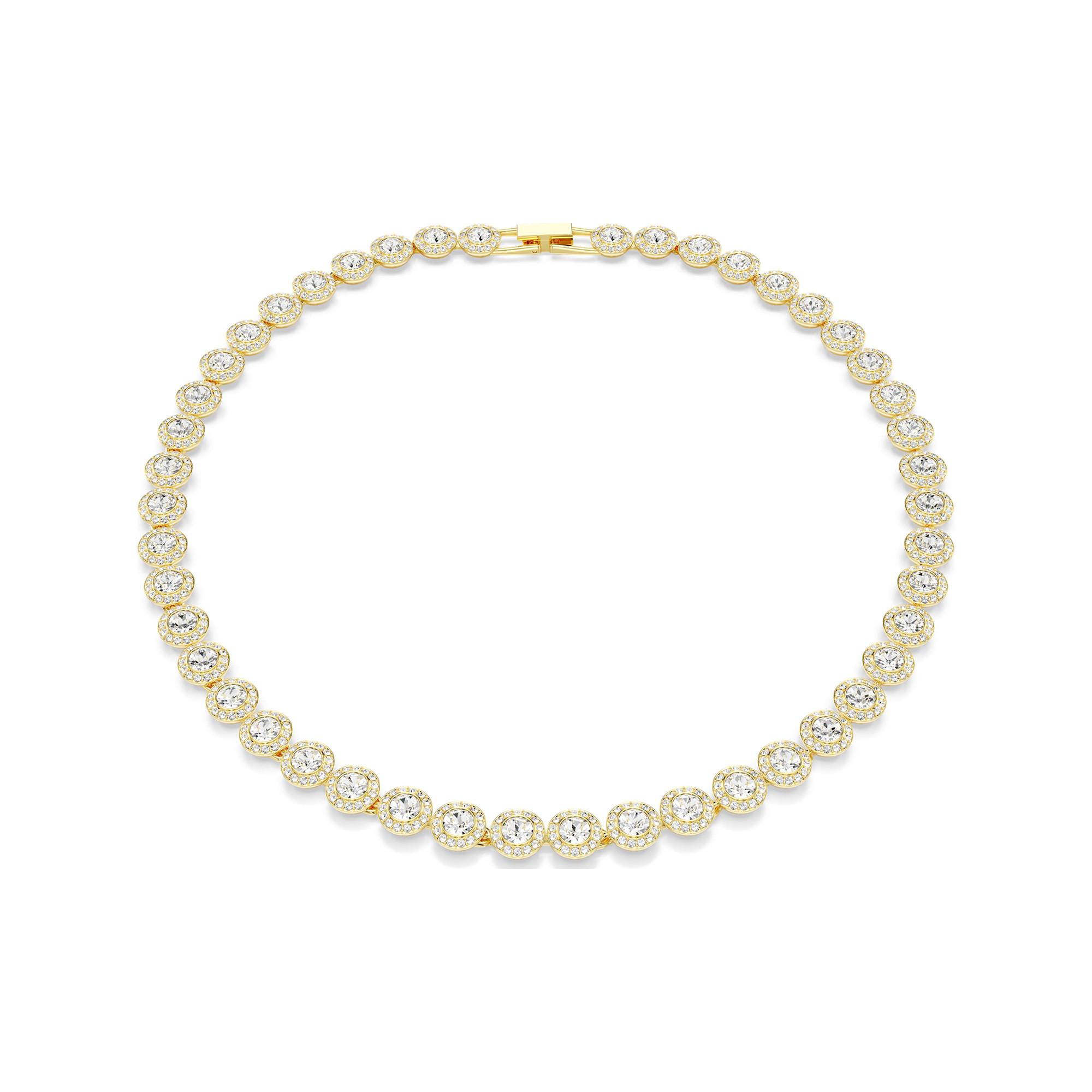 Questa collana radiosa colpisce per l'eleganza senza tempo ed è quindi uno dei modelli più popolari firmati Swarovski. La creazione in lega d'oro presenta cristalli arrotondati di grandi dimensioni, ciascuno dei quali è realizzato con una gru pavé trasparente.