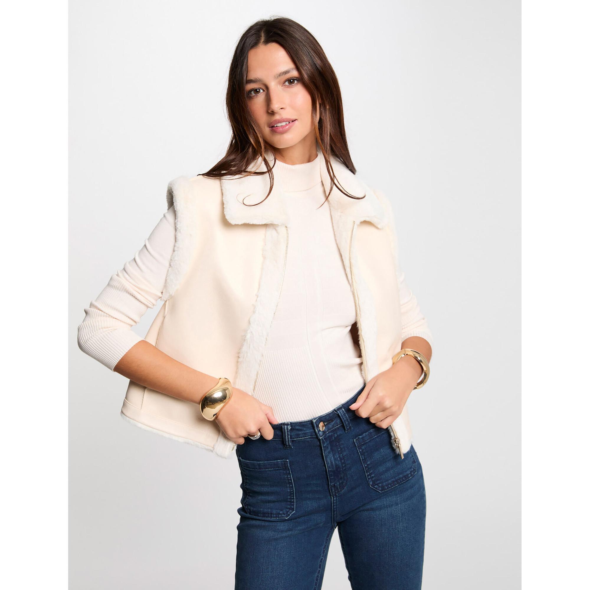 Questo giubbotto gilet di Morgan è un modello corto senza maniche con una vestibilità dritta e un colletto con revers. Presenta una chiusura con zip sul davanti ed è realizzato in similpelle. La fodera interna e gli inserti sulle braccia, sullo scollo e sul davanti sono in pelliccia sintetica.