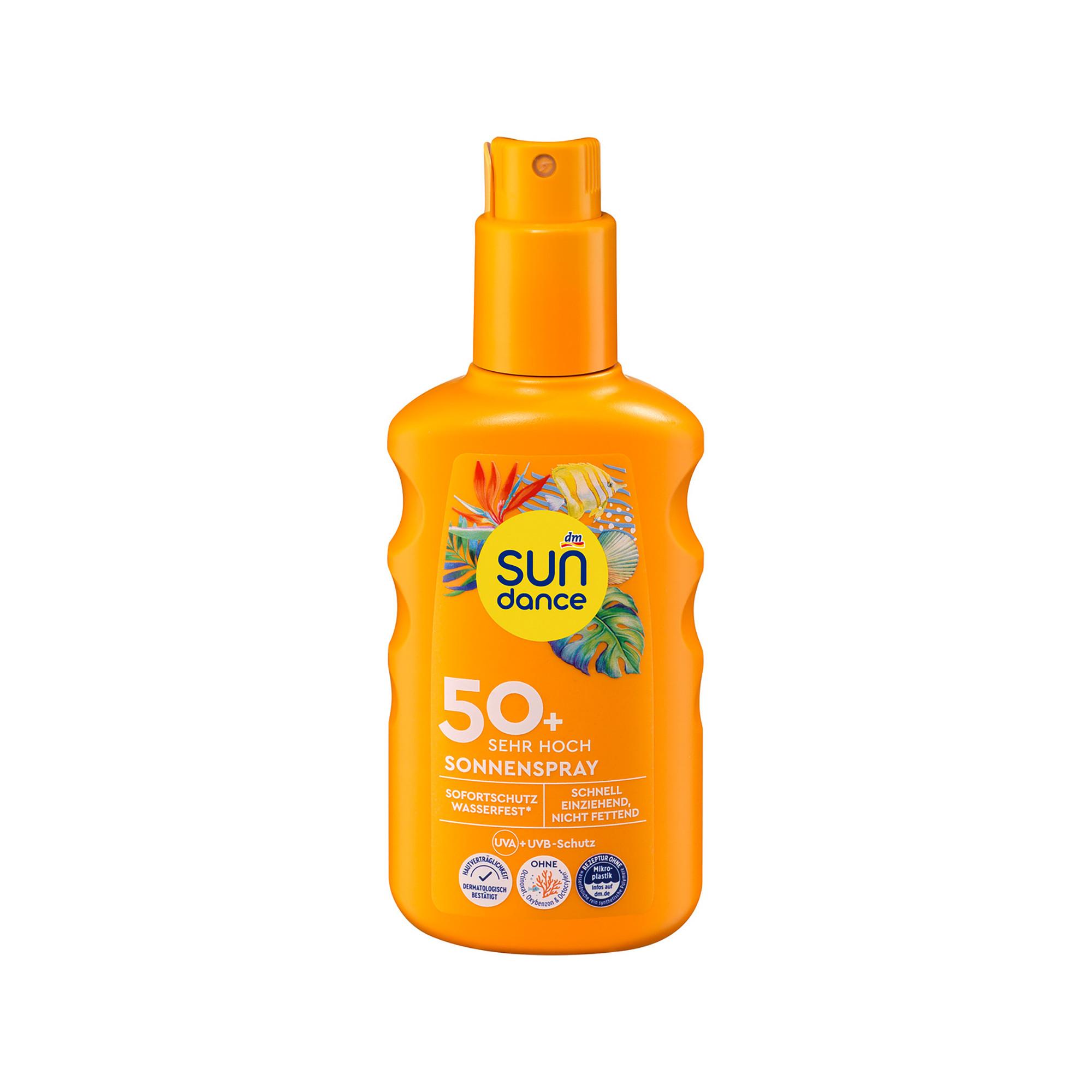 Lo spray solare SUNDANCE con SPF 50+ previene l'invecchiamento precoce della pelle indotto dalla luce e le macchie pigmentarie se usato regolarmente. Compatibilità cutanea dermatologicamente confermata. Impermeabile (Confermato da un istituto di prova indipendente: Dopo 40 minuti in acqua, rimane almeno il 50% del fattore di protezione solare dichiarato). Per rispetto dei nostri oceani, senza i filtri UV ottinoxato, ossibenzone e octocrilene. Vegan.