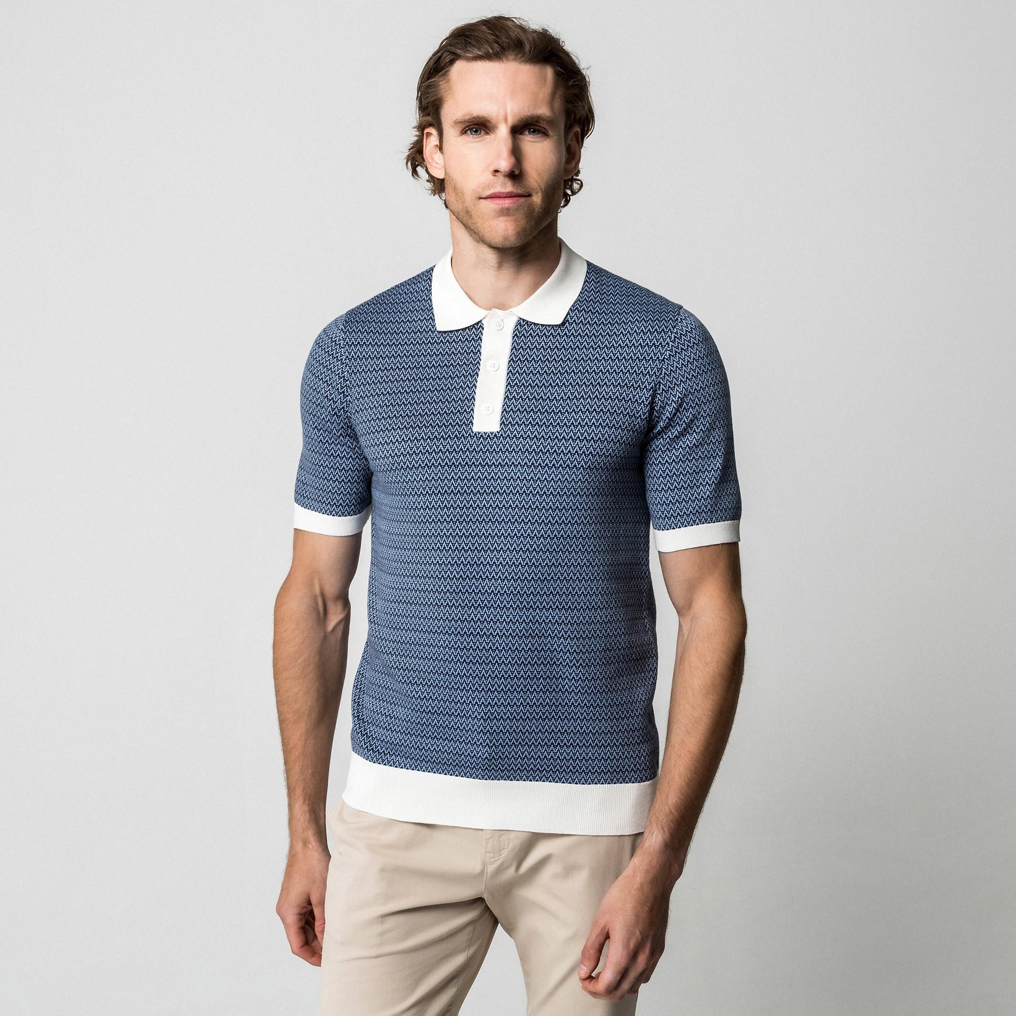 Questo maglione combina un classico colletto a polo con una maglia fine e fantasia. Le finiture a contrasto sul colletto e sugli orli creano accenti sottili e conferiscono al design un tocco moderno. Un compagno elegante per look casual e da ufficio curati.