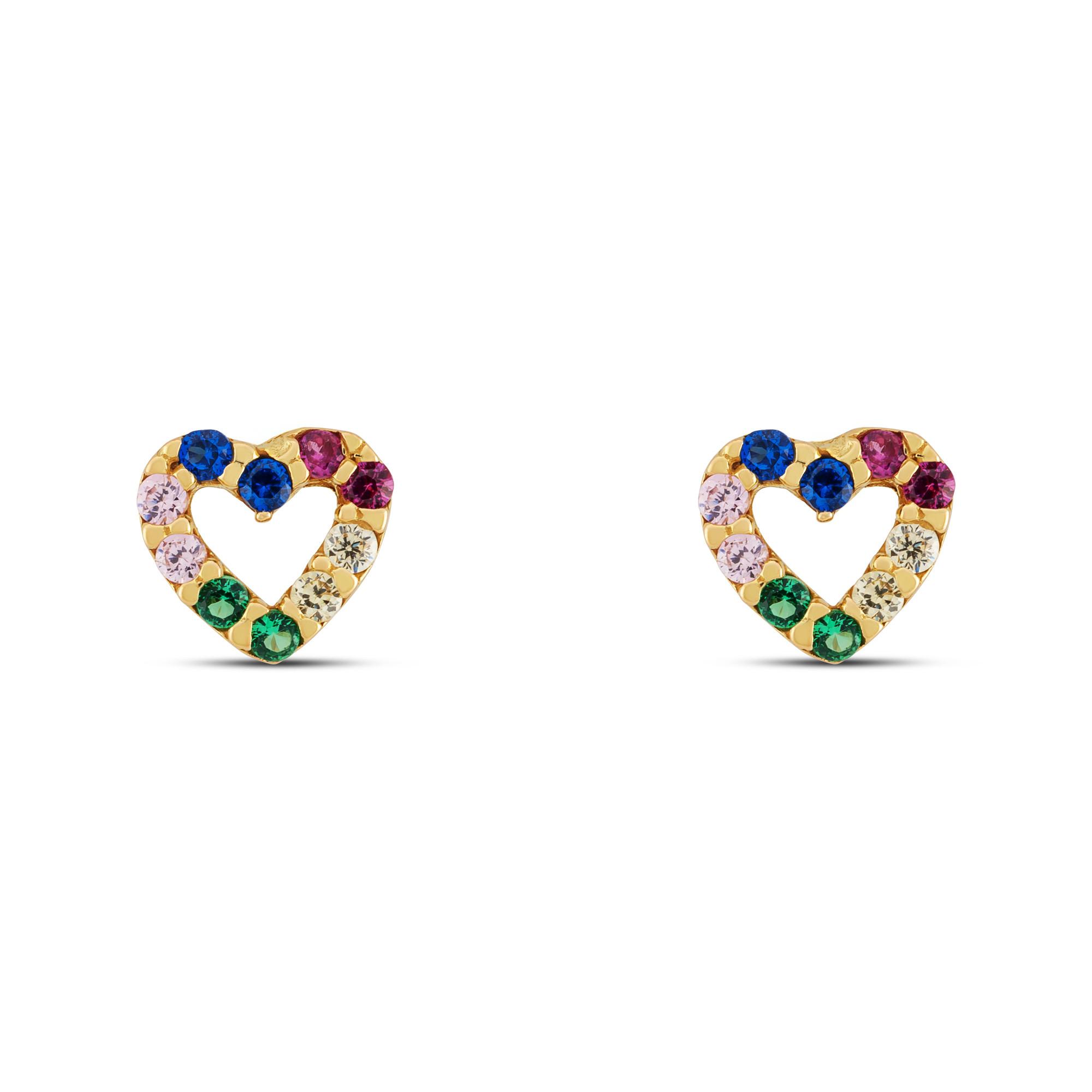 Questi giocosi orecchini a forma di cuore firmati Caramel in oro giallo 18 carati e zirconi sono perfetti per tutti i giorni con un design purista contemporaneo. Si chiudono classicamente con una chiusura a farfalla.