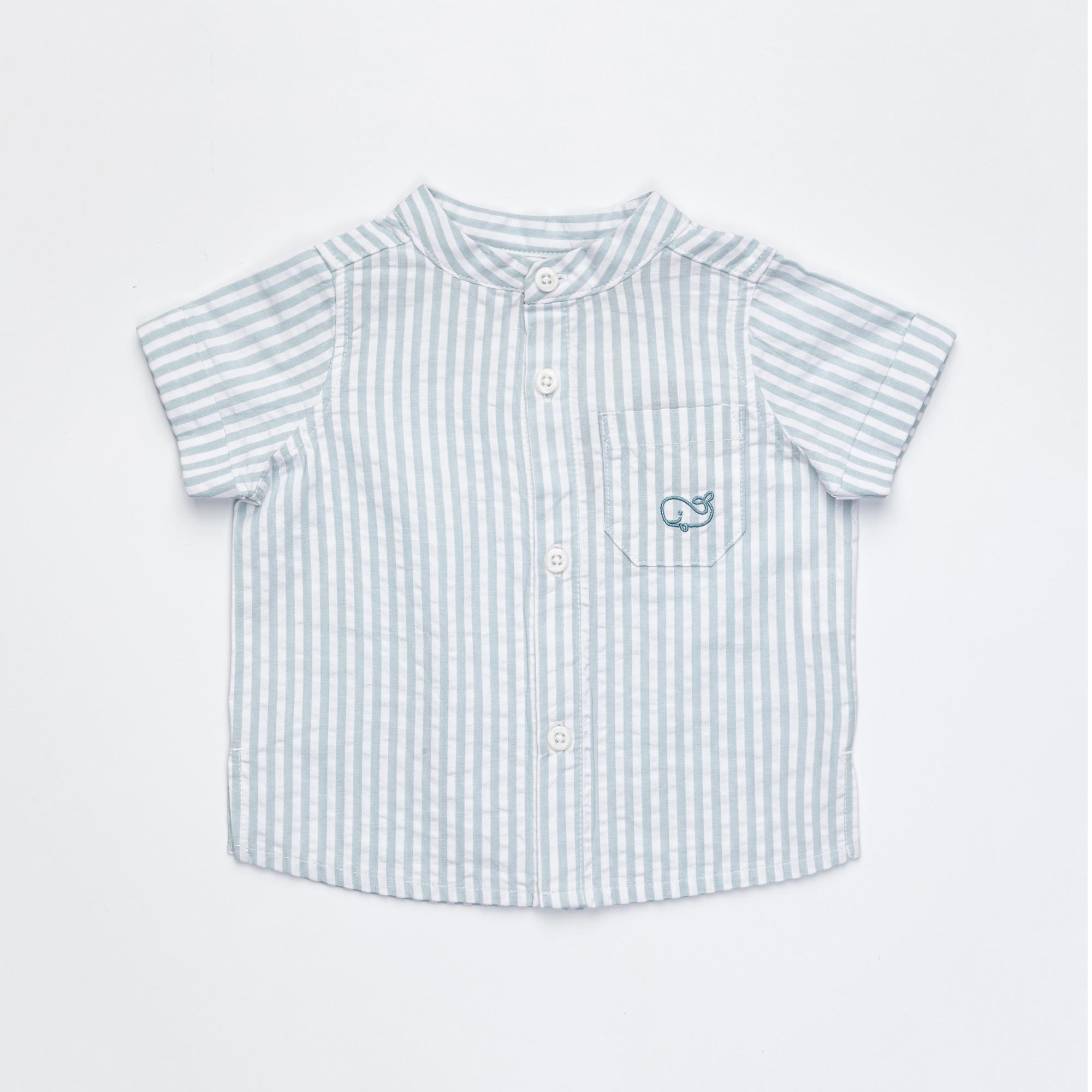 La camicia a maniche corte firmata Manor Baby è realizzata in 100% cotone biologico e presenta un classico design a righe verticali. L'abbottonatura continua, la tasca sul petto e gli spacchi laterali assicurano dettagli funzionali. Una piccola balena ricamata completa il design a misura di bambino.