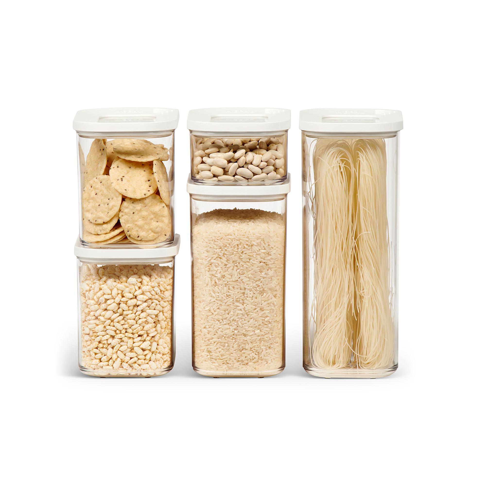 Set iniziale di 5 contenitori Modula. Questo pratico set Modula è composto da: 1 x 2000 ml, 1 x 1500 ml, 2 x 1000 ml e 1 x 425 ml. Il coperchio trasparente con bordo bianco e guarnizione garantisce una tenuta perfetta, rendendo queste scatole ideali per la conservazione di alimenti secchi come caffè, farina, patatine, erbe e pasta. Le scatole per alimenti e per la conservazione Modula sono disponibili in diverse dimensioni e versioni e sono facili da tenere e da aprire. Inoltre, sono impilabili e lavabili in lavastoviglie.