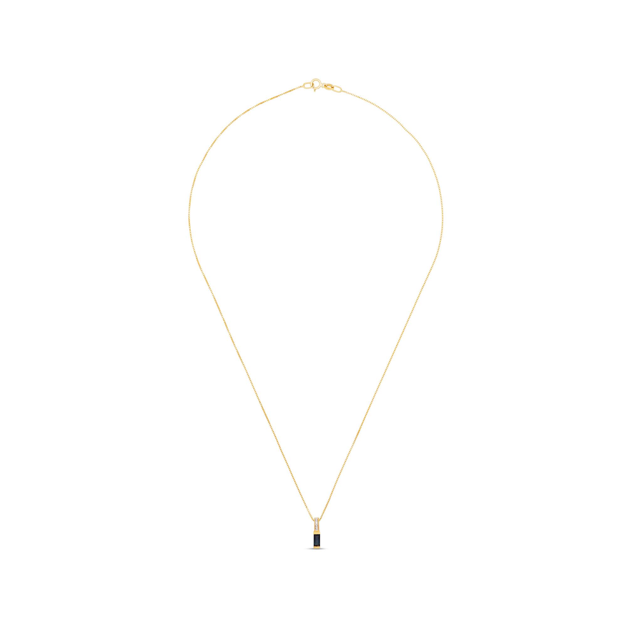 Questa collana firmata L'Atelier Gold 18 Karat by Manor è composta da una catena in oro giallo in filigrana, il cui ciondolo di forma allungata è incastonato con zaffiro sfaccettato e diamanti taglio brillante e si muove liberamente. La catena si chiude con stile con un anello a molla.