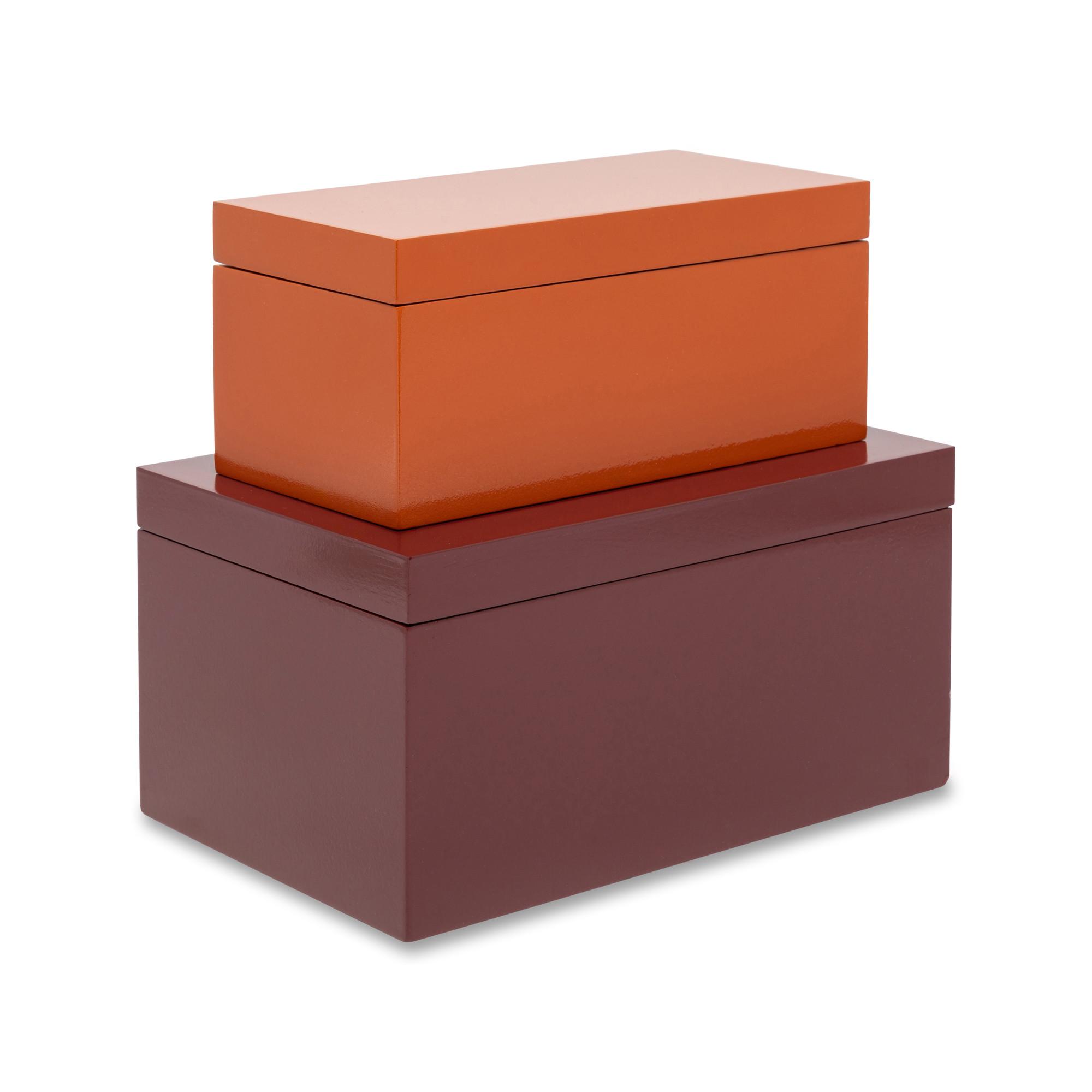 Questo set firmato Manor è composto da due semplici scatole portaoggetti in legno laccato certificato FSC. Scatola grande: 23 x 15 x 12 cm Scatola piccola: 20 x 10 x 9 cm