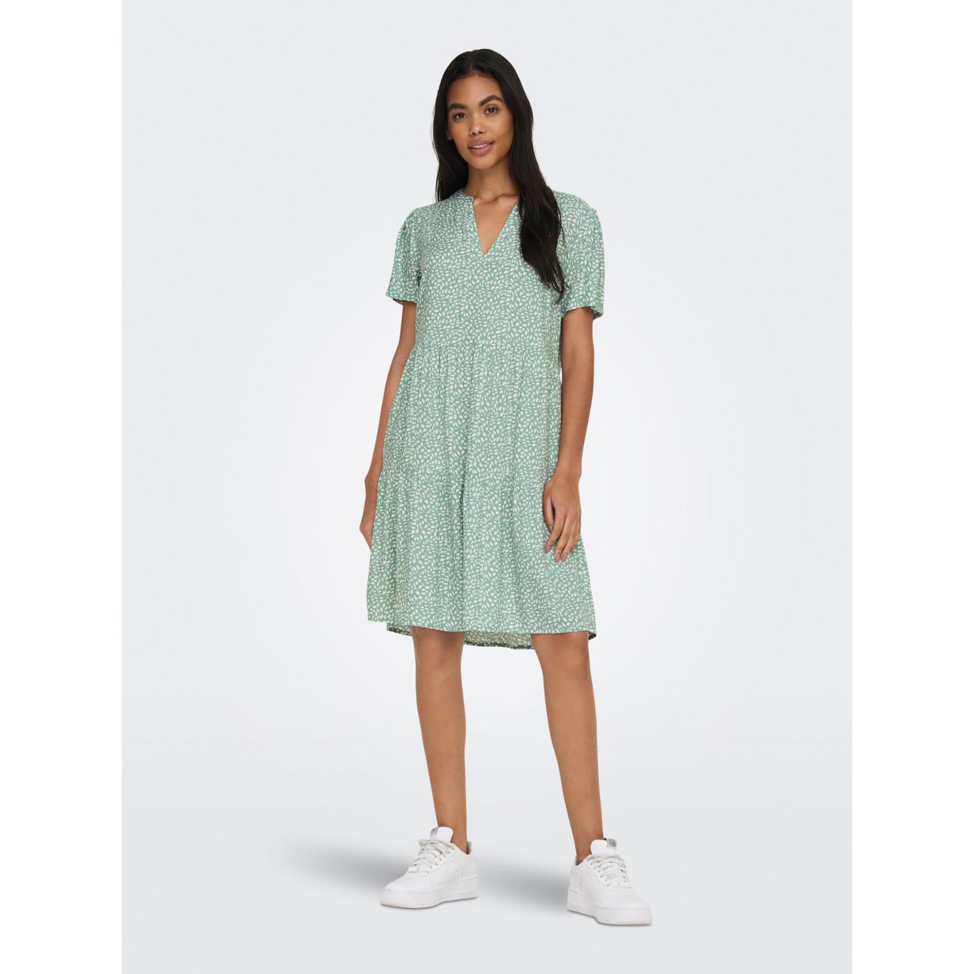 Questo vestito mini a maniche corte presenta uno scollo a V e una gonna a balze, creando una silhouette rilassata ed elegante. Il motivo a foglie all-over aggiunge un tocco di fascino ispirato alla natura, rendendolo un capo versatile per varie occasioni. La viscosa è un materiale morbido e leggero con una piega fine, creando così una superficie molto bella e setosa.