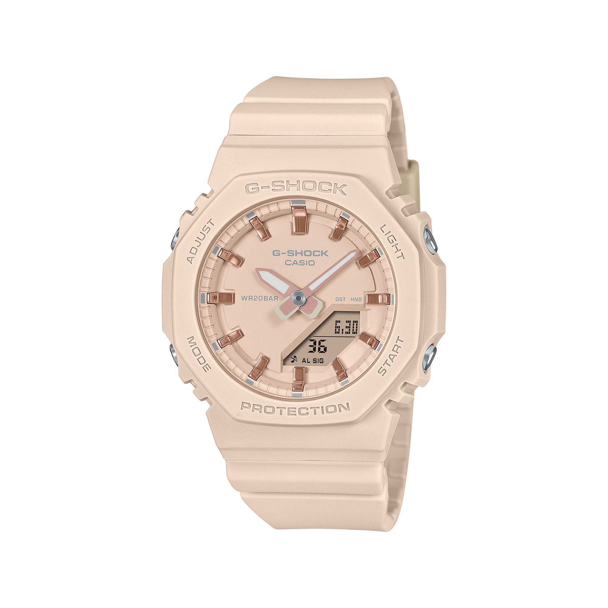 Il G-SHOCK GMA-P2100 combina il popolare stile digitale-analogico con eleganti indicatori in oro rosa e un design compatto