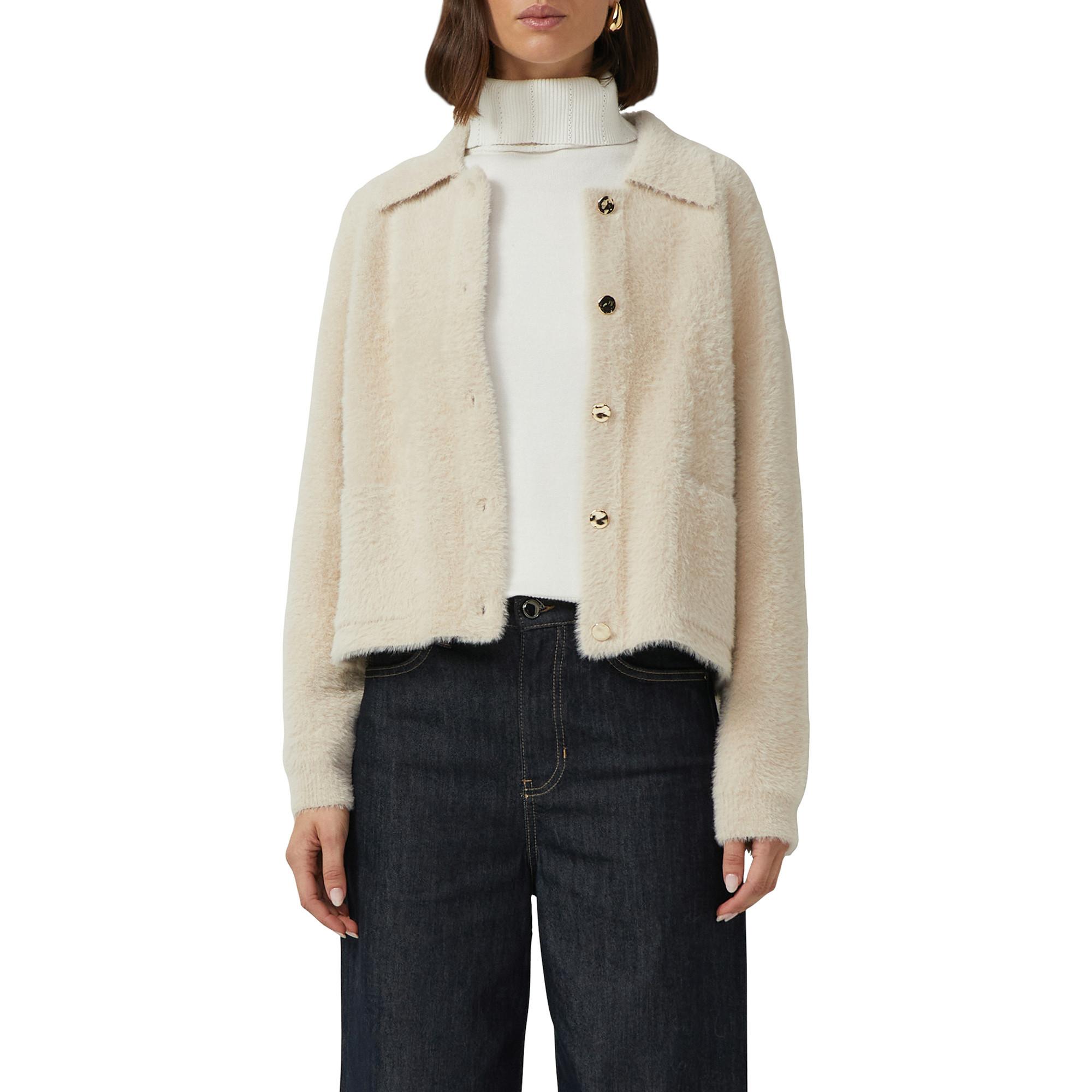 Questa giacca in pelliccia sintetica aderente con colletto a camicia e bottoni color oro aggiunge una struttura elegante a un outfit. La miscela di materiali di alta qualità garantisce una sensazione confortevole e un calore elegante – un vero capo d'effetto. È ideale per occasioni speciali durante le stagioni più fresche.