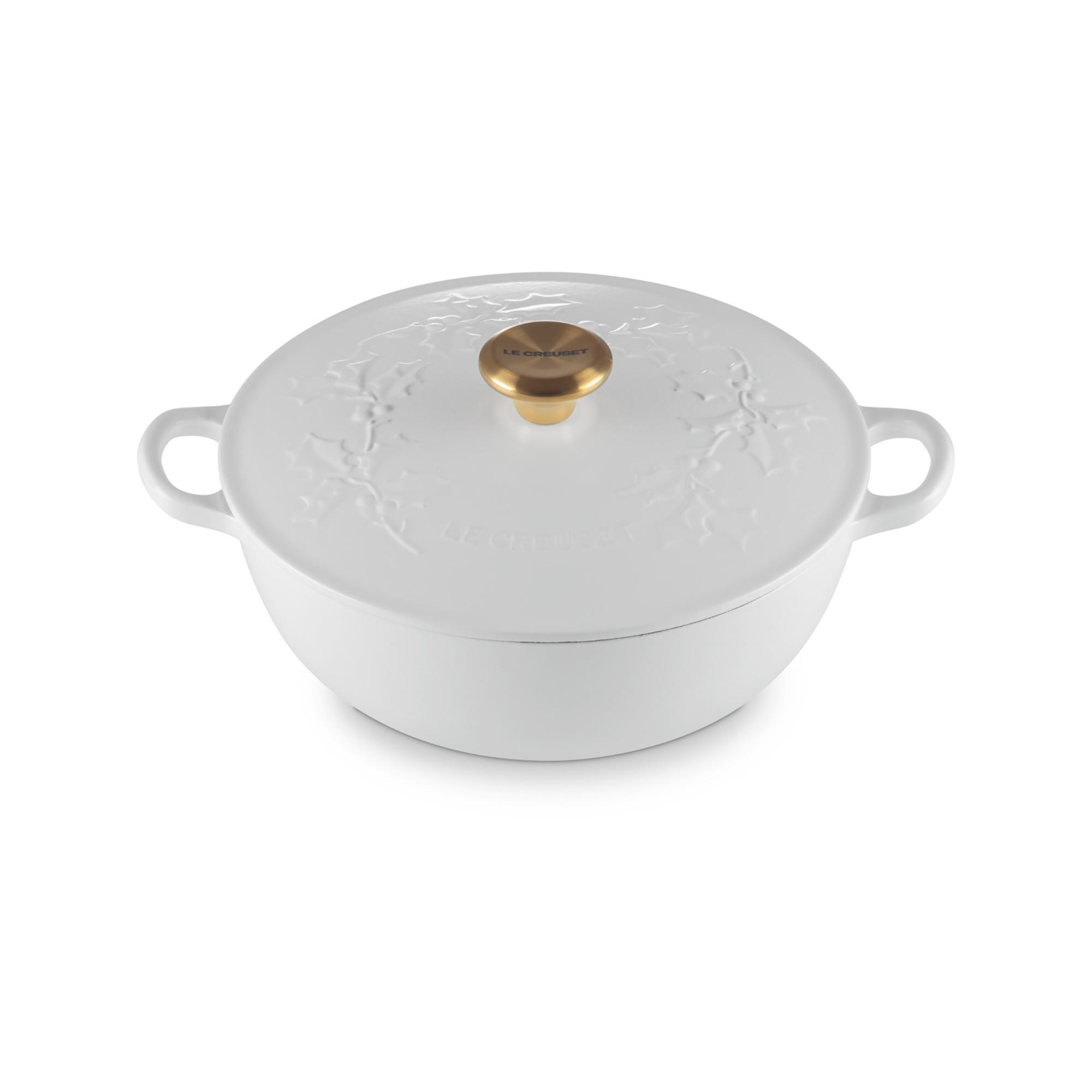 La Marmite, molto apprezzata della nostra collezione Holly in edizione limitata, è decorata con ornamenti decorativi in agrifoglio e sormontata da un pomello dorato. È un vero classico in cucina, versatile e semplice, e un prezioso cimelio. Riempita con un fumante boeuf bourguignon o una zuppa confortante, La Marmite sarà la star della vostra tavola.