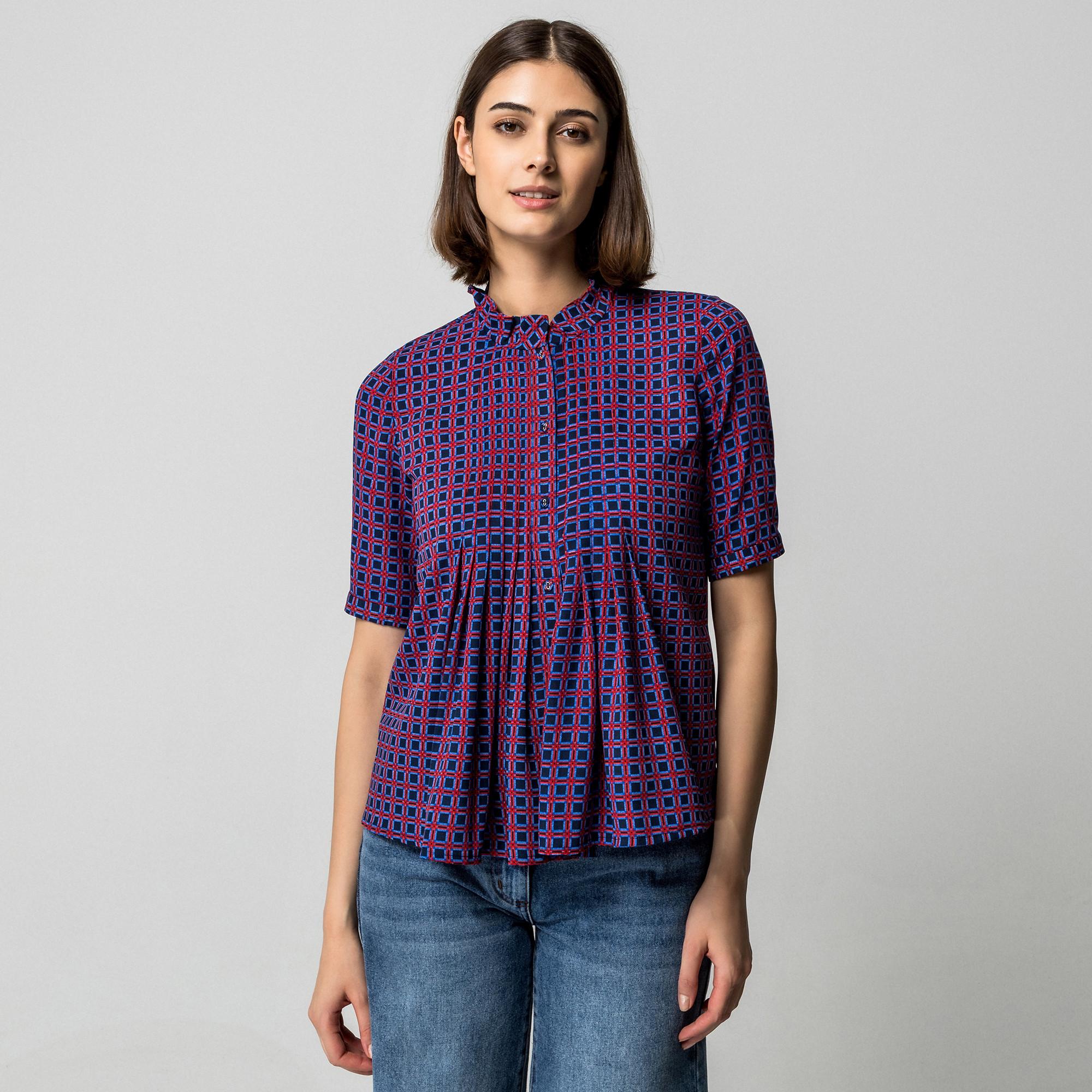 Questa camicetta con stampa retrò e pieghe morbide si rivela un capo basic versatile e affidabile per tutti i giorni, con una silhouette giocosa e un atteggiamento di tendenza. La camicetta a maniche corte ha un colletto alla coreana con volant ed è completamente abbottonata.
