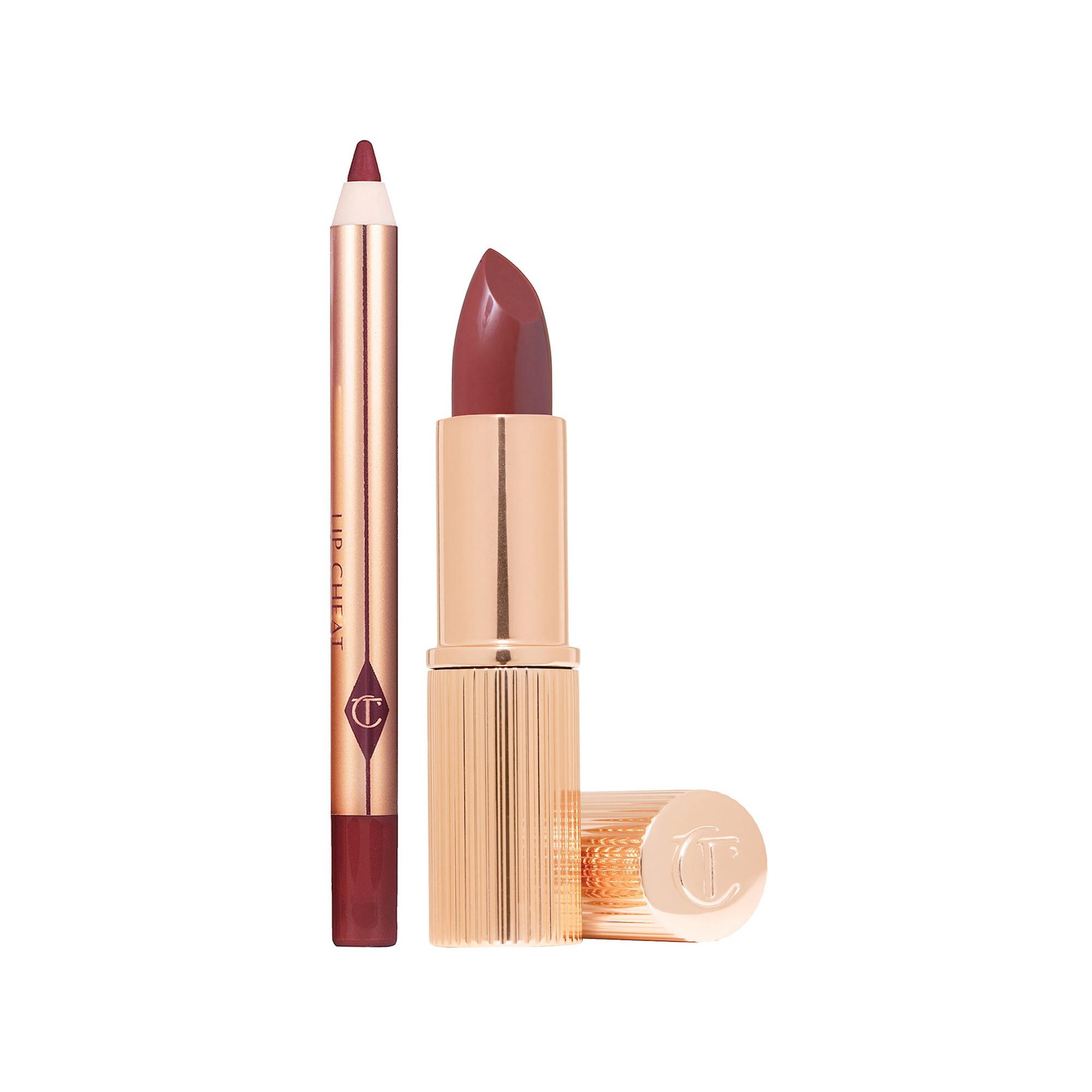 Pillow Talk Medium: un mini rossetto Matte Revolution rosa lampone dorato e una matita labbra Lip Cheat nella tonalità Pillow Talk Medium.