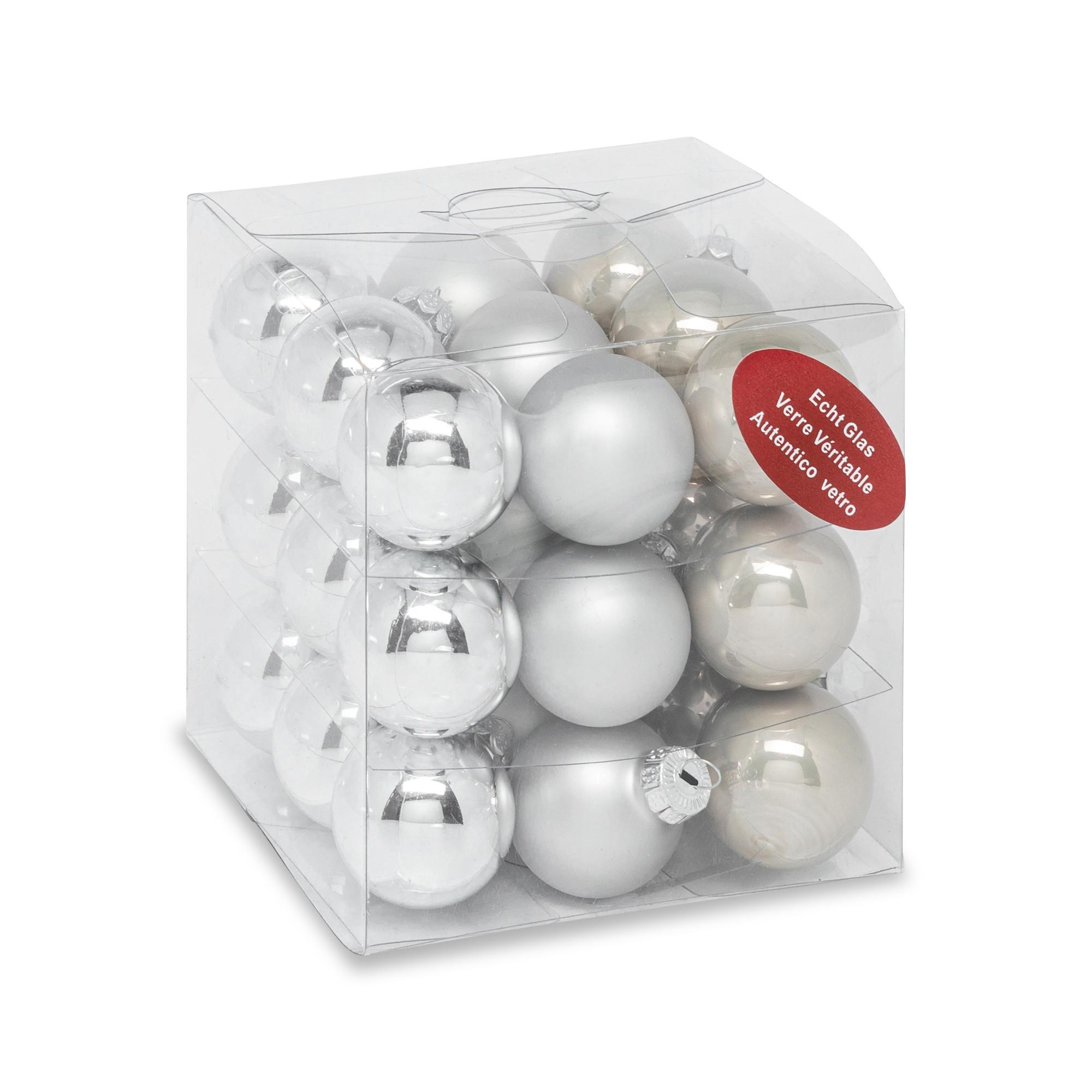 Questo set di Natale firmato Manor contiene tre diversi tipi di palline, assortite in un design monocromatico. Le palline sono provviste di un passante da appendere e sono realizzate in vetro. Contenuto: 27 pezzi da 3 cm di diametro lucido, con superficie riflettente lucido opaco