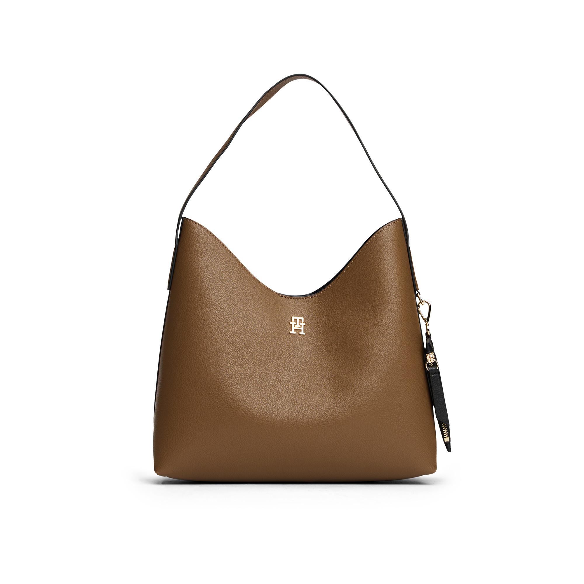 L'eleganza sobria e raffinata è il tratto distintivo della borsa a spalla, contraddistinta dalla silhouette semistrutturata con finitura zigrinata e dal monogramma TH. È un accessorio elegante e pratico per l'uso quotidiano, con un design moderno e senza tempo.