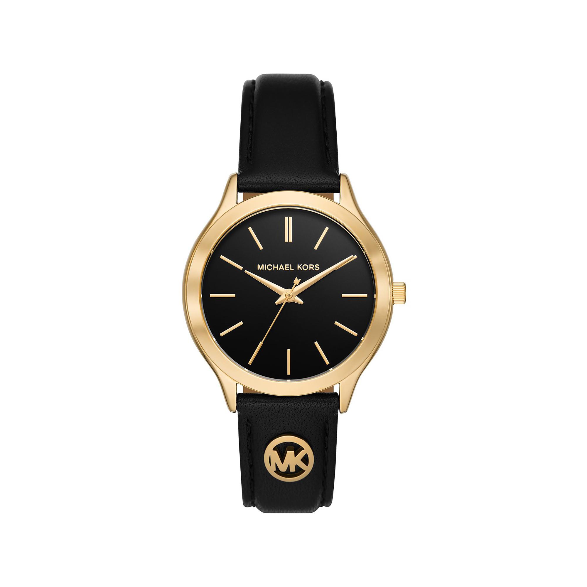 L’orologio da donna Runway Slim di Michael Kors unisce stile classico e dettagli moderni, diventando un elegante compagno per tutti i giorni. Il cinturino in pelle nera e il quadrante nero si abbinano perfettamente alla cassa in metallo dorato lucido di 38 mm di diametro.