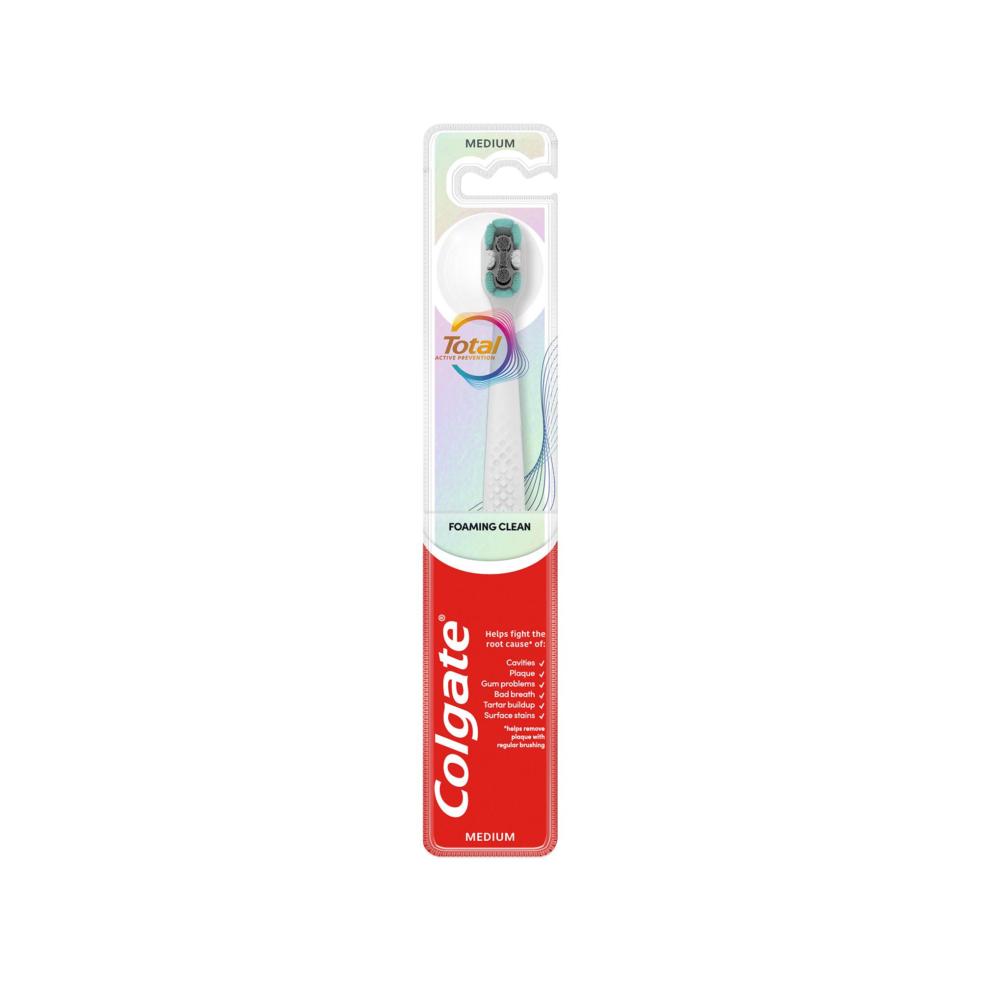 Spazzolate il vostro sorriso senza preoccupazioni con lo spazzolino Colgate Total Foaming Clean. Questo spazzolino è stato appositamente progettato per una protezione attiva, aiutando ad affrontare la causa principale¹ di carie, placca, problemi gengivali, alito cattivo, accumulo di tartaro e scolorimento superficiale, in modo da garantire una cura dentale efficace e completa. Lo spazzolino offre una pulizia accurata con una schiuma rapida che diffonde il dentifricio in profonditಠnella bocca. Grazie alle setole a punta di filo interdentale, questo spazzolino pulisce più a fondo² lungo il bordo gengivale e tra i denti. Con Colgate, la protezione di cui avete bisogno per mantenere il vostro sorriso sano.