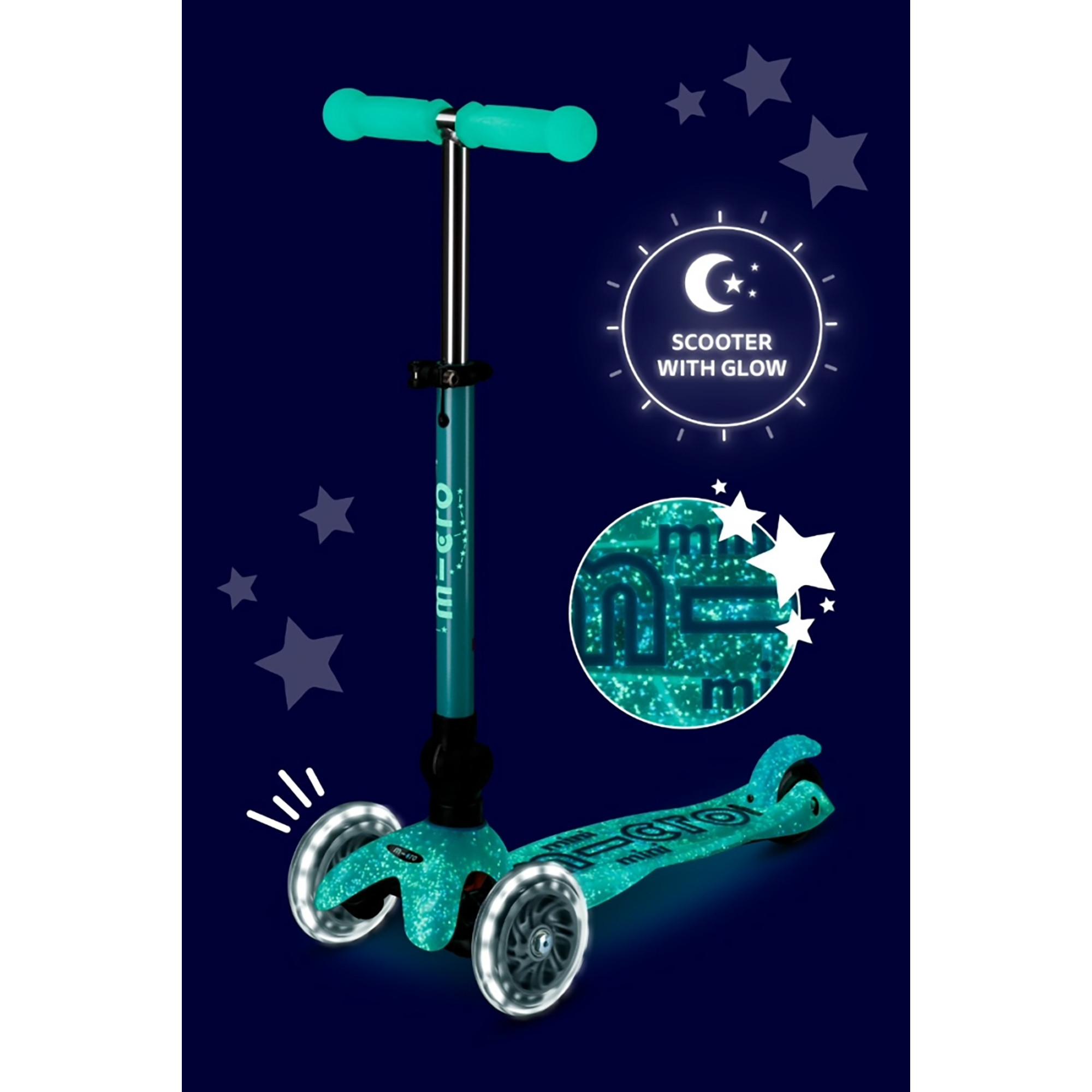 Scopri il Mini Micro Deluxe Orion Foldable LED e tuffati in avventure luminose! Questo monopattino unico prende vita al buio: il pianale e il freno sono decorati con particelle stellate che si ricaricano alla luce del sole o alla luce UV artificiale e brillano al buio. Gli elementi scintillanti conferiscono al monopattino un fascino particolare, senza bisogno di batterie. Inoltre, il manubrio con effetto scintillante aggiunge un tocco luminoso.