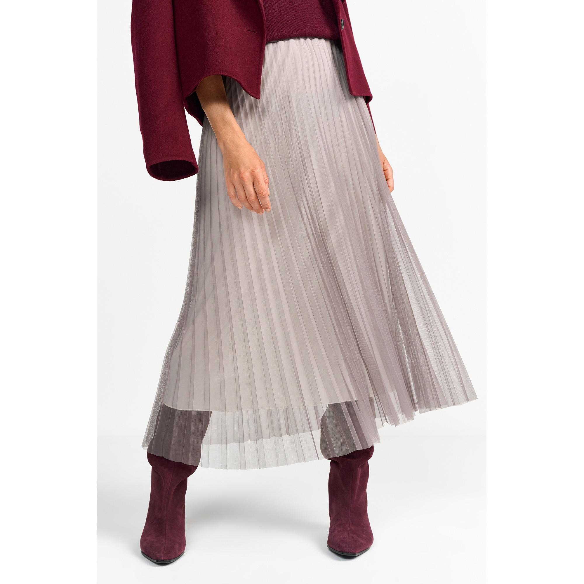 La gonna plissettata si distingue per le pieghe sottili e la fascia elastica in vita. Il tessuto semitrasparente dona un tocco moderno e femminile.