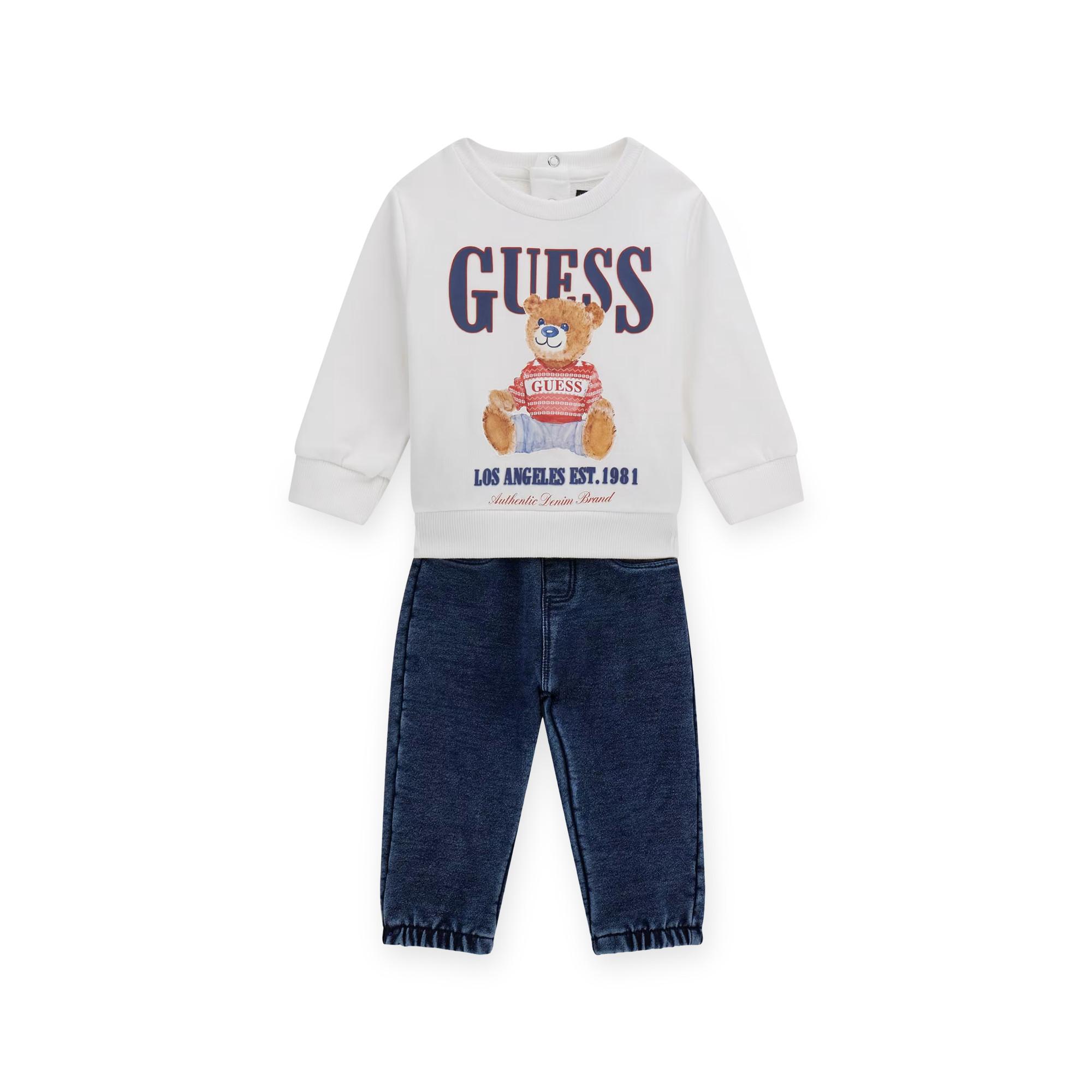 Il set Guess da 2 pezzi è composto da una felpa e un paio di jeans in morbido cotone. La felpa ha girocollo, maniche lunghe e chiusura con bottoni sul retro, mentre i jeans sono dotati di vita elastica, gamba dritta e coulisse per il massimo comfort. La stampa con orsetto e logo sul davanti completa il look – perfetto per i più piccoli.