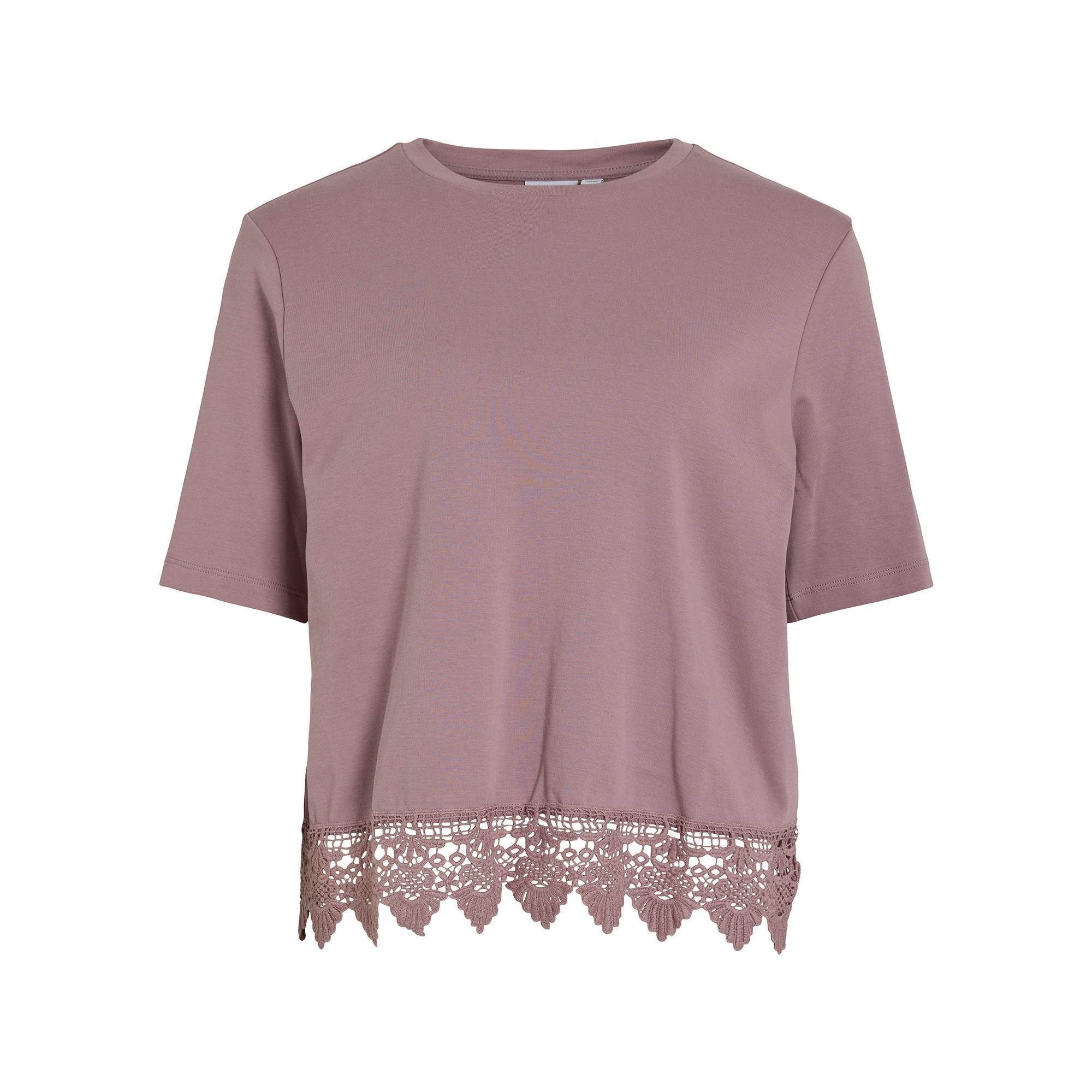 La t-shirt ha un taglio regular e uno scollo rotondo classico. Il bordo in guipure aggiunge un dettaglio femminile al design essenziale. È ideale per outfit quotidiani con un tocco raffinato.