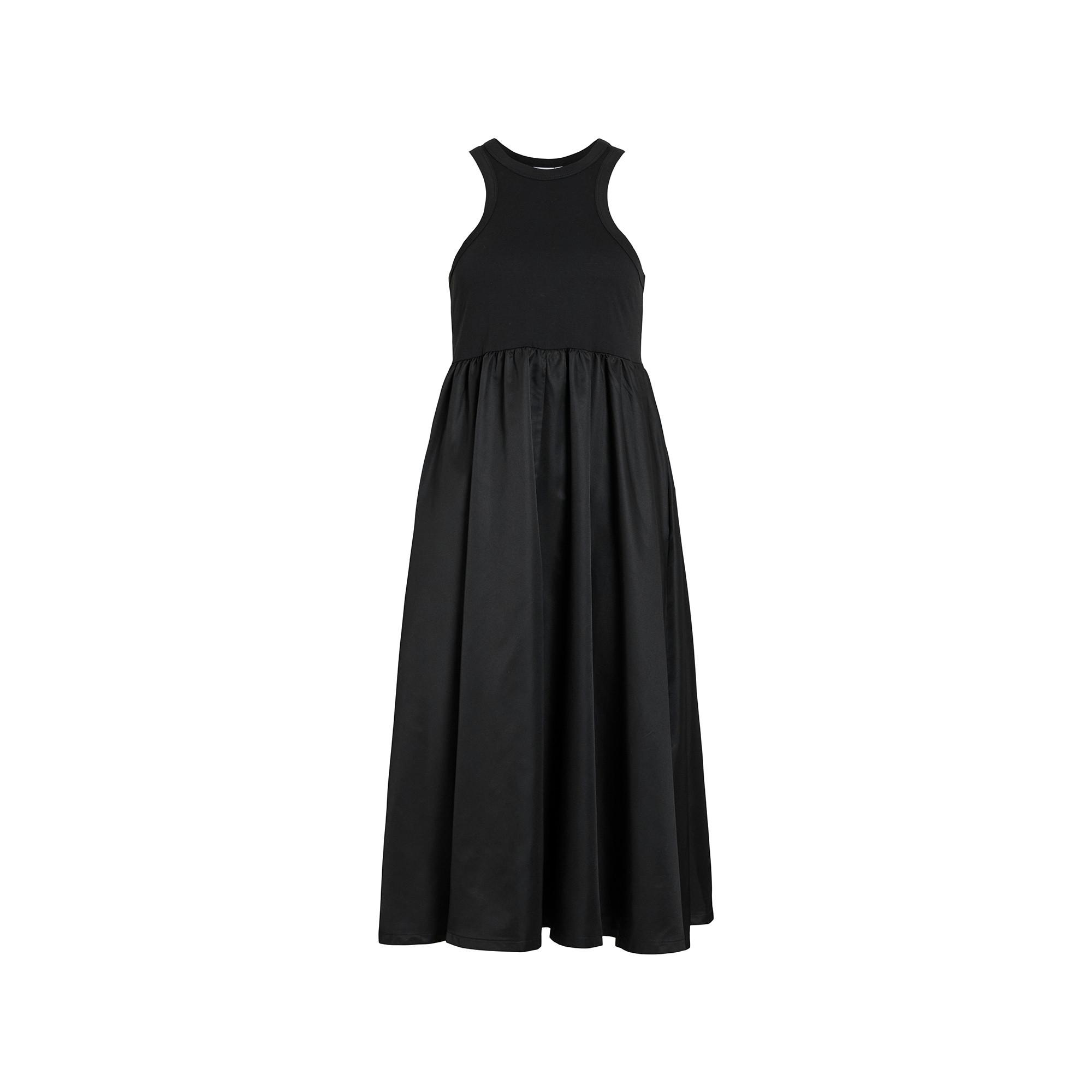 L’abito smanicato presenta uno scollo rotondo essenziale e leggere arricciature che valorizzano la vita. La linea svasata dona movimento e femminilità alla silhouette. Perfetto per le giornate estive con un tocco di stile.