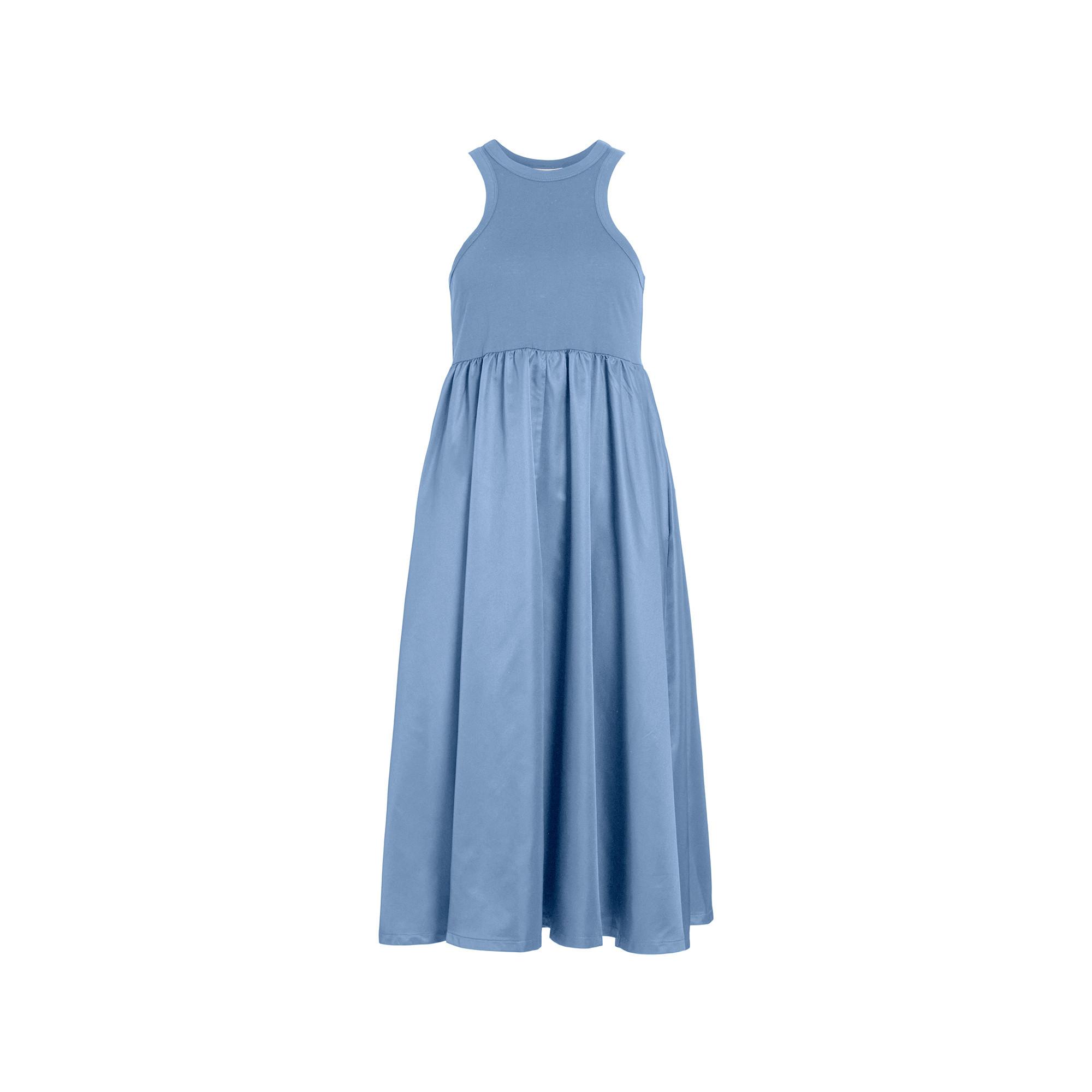 L’abito smanicato presenta uno scollo rotondo essenziale e leggere arricciature che valorizzano la vita. La linea svasata dona movimento e femminilità alla silhouette. Perfetto per le giornate estive con un tocco di stile.