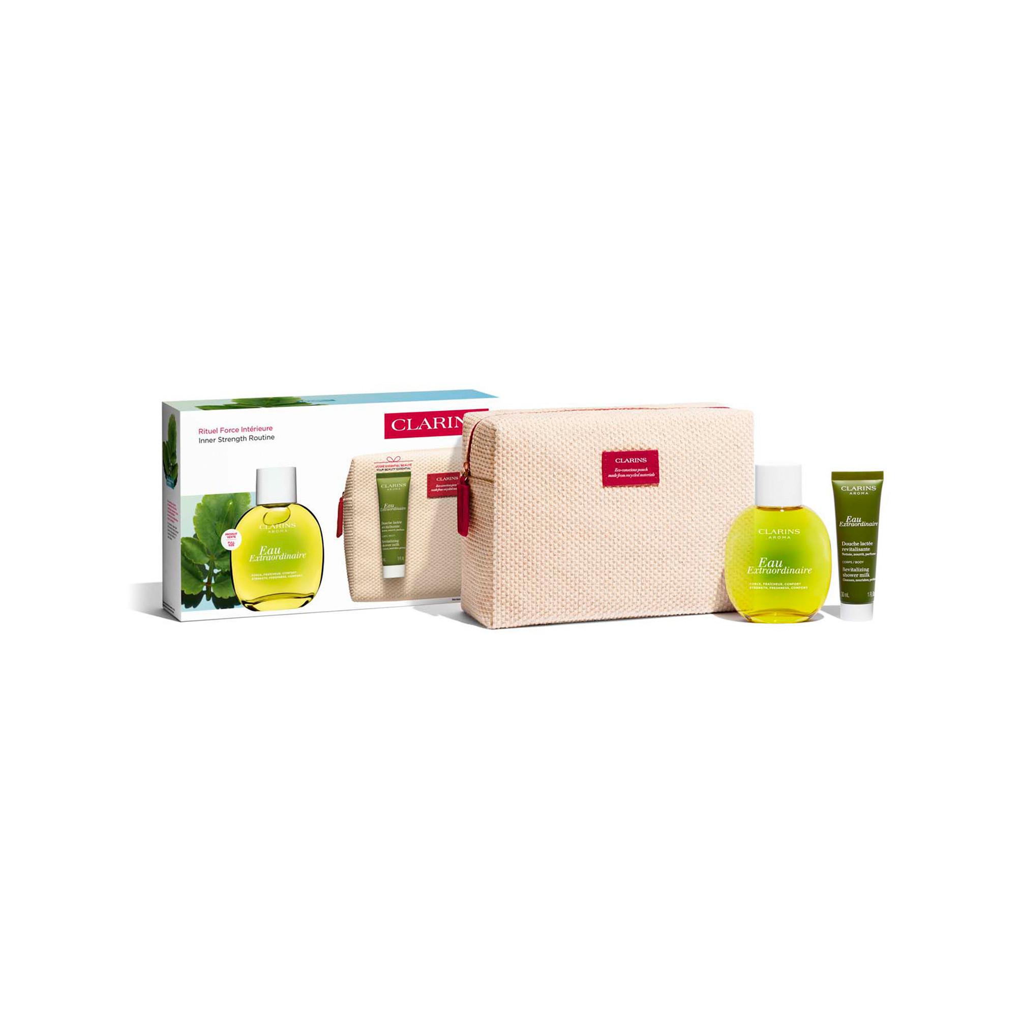 Questo set unisce in una grande pochette Eau Extraordinaire, l’ultima acqua di trattamento di Clarins, e un gel doccia con il rinvigorente profumo di Eau Extraordinaire, formulato con olio di mandorla biologico.