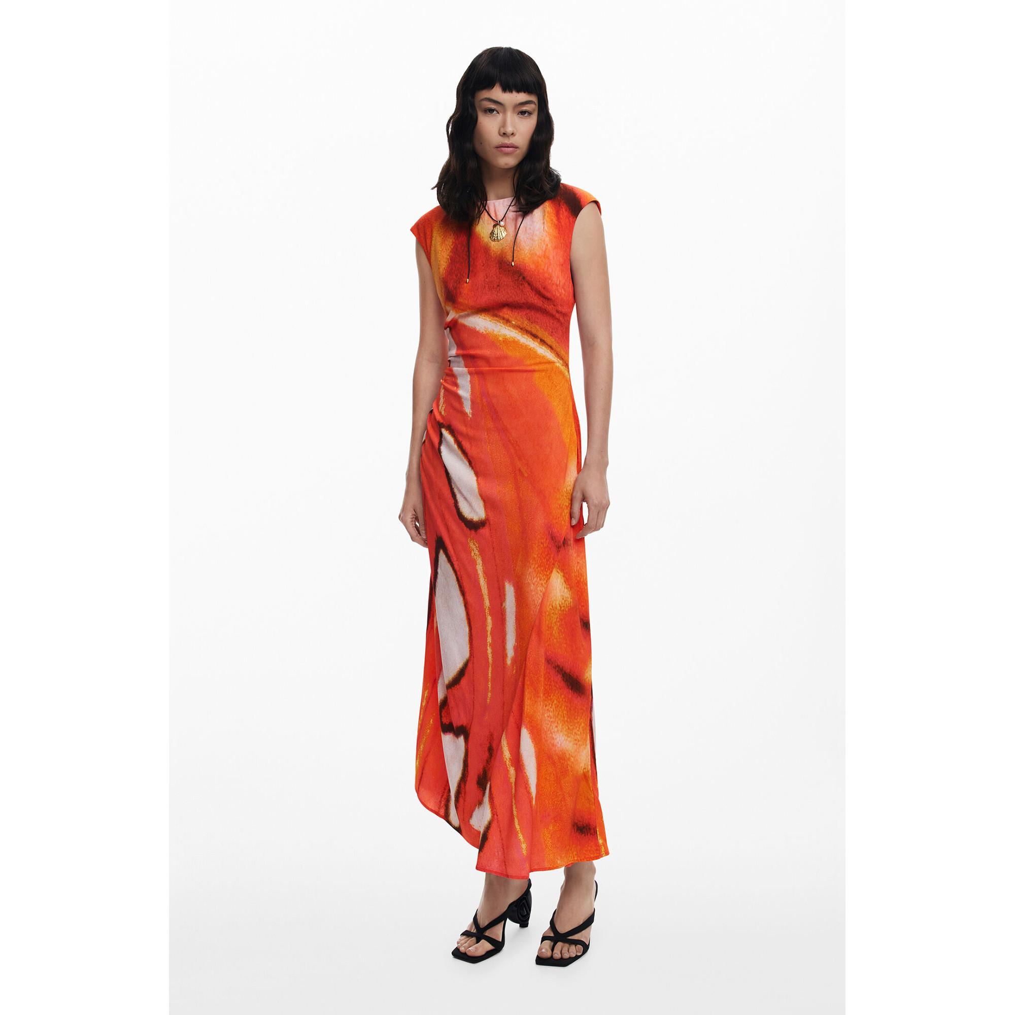 Questo vestito lungo senza maniche di Desigual presenta un motivo etnico multicolore e un drappeggio in vita. La linea sagomata valorizza una silhouette femminile e fluida, rendendolo un'aggiunta sorprendente a qualsiasi guardaroba.