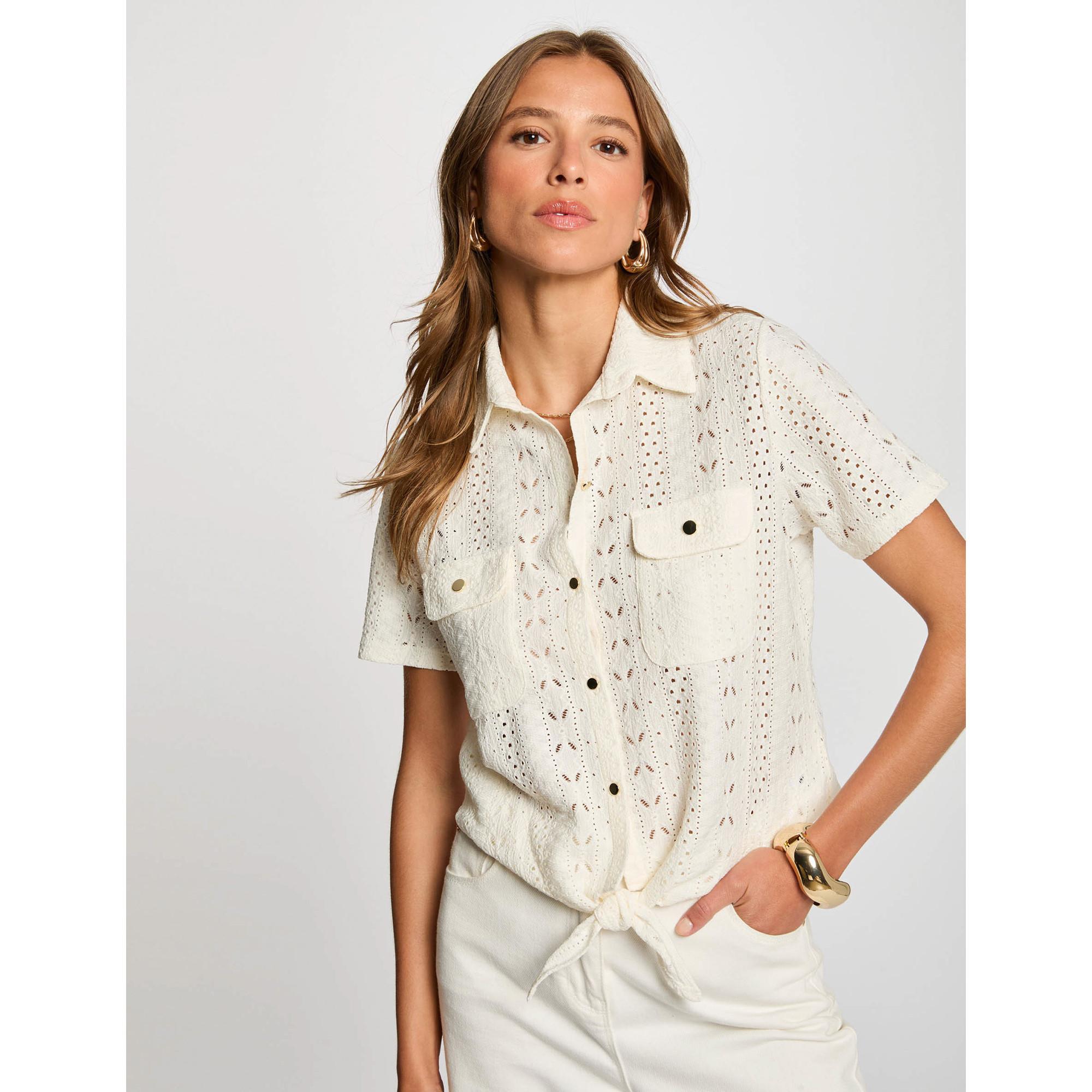 Questa camicia a maniche corte presenta un intricato motivo a occhielli su tutta la superficie, offrendo un look delicato ed elegante. Il design include un colletto classico e un'abbottonatura completa, fornendo un'opzione versatile per varie occasioni. Due tasche sul petto con chiusura a bottone aggiungono un elemento funzionale e decorativo alla parte anteriore.