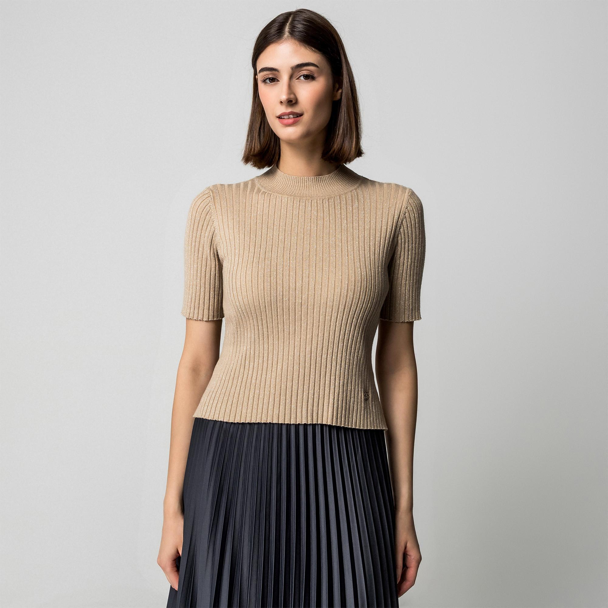 Questo maglione a maniche corte si distingue per il collo alto e la sottile struttura a coste. Il materiale elasticizzato garantisce comfort e una silhouette moderna. È perfetto per look di transizione o come base sotto un blazer.