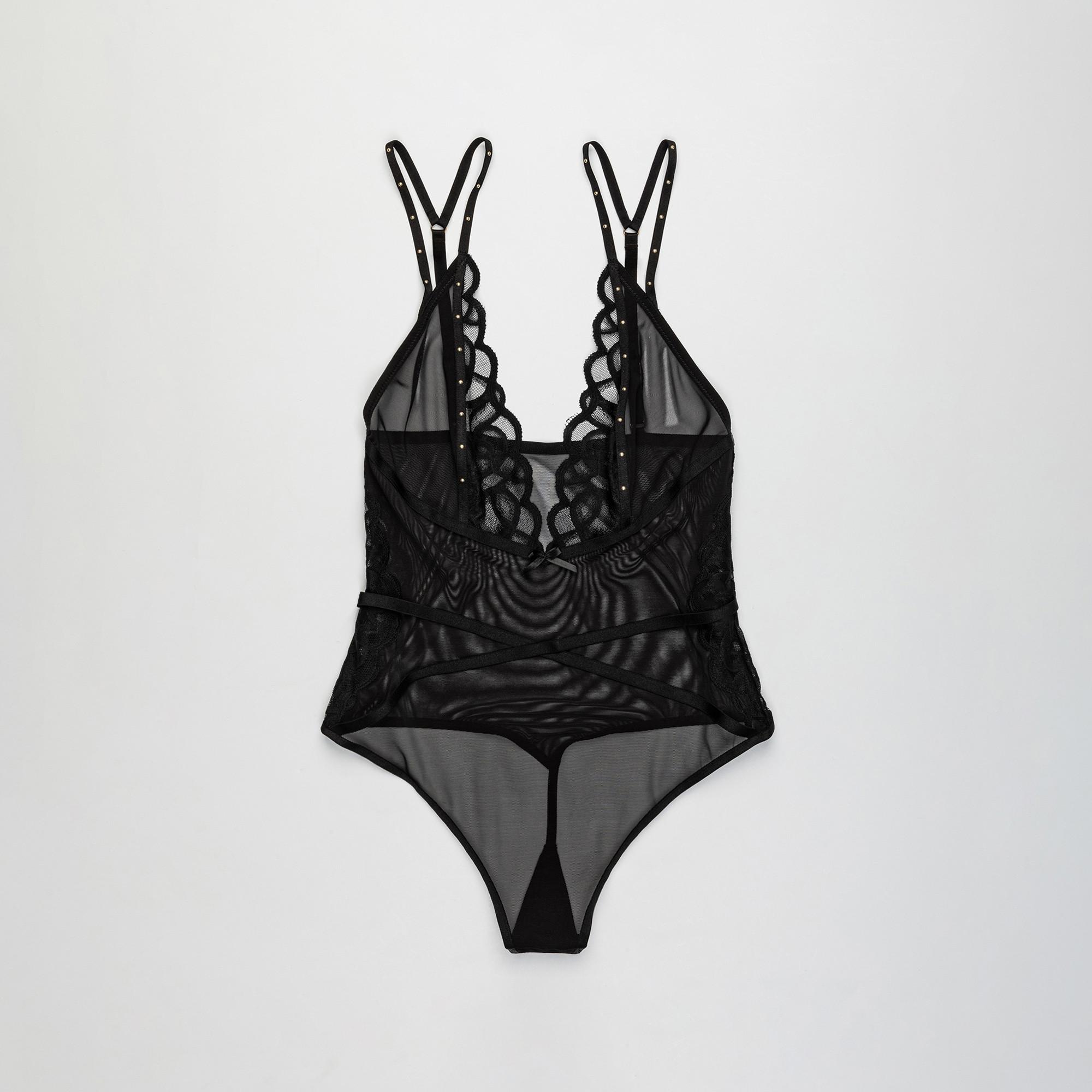 Questo body combina pizzo delicato con tessuto semi-trasparente per un look seducente. Il design presenta dettagli in pizzo intricati e un fiocco decorativo, creando un'estetica sofisticata ma sensuale. Le spalline regolabili sono adornate con piccole borchie, aggiungendo un tocco di eleganza audace.