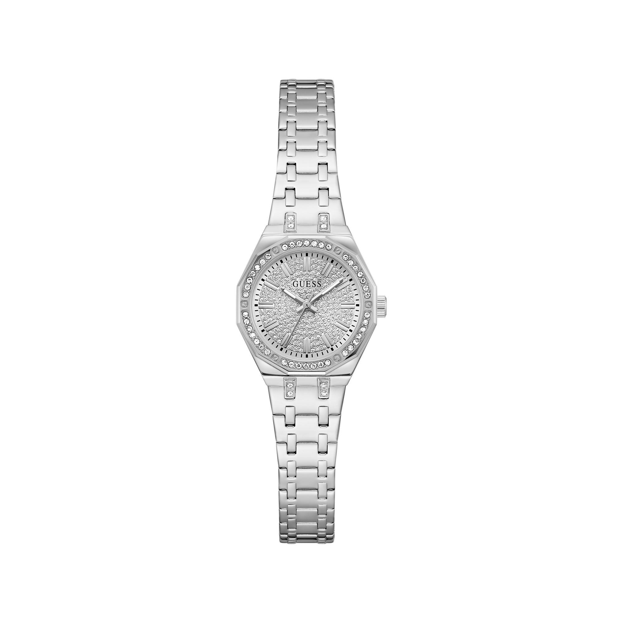 L'orologio da polso da donna Pixie firmato Guess incanta con un look completamente argentato e pietre scintillanti su quadrante, lunetta e bracciale. Il design elegante è completato da un preciso movimento al quarzo e da una robusta cassa in acciaio inossidabile. Diametro della cassa circa 25 mm, altezza 7,95 mm Cinturino in acciaio inossidabile con chiusura pieghevole Dettagli scintillanti e impermeabile a 30 m