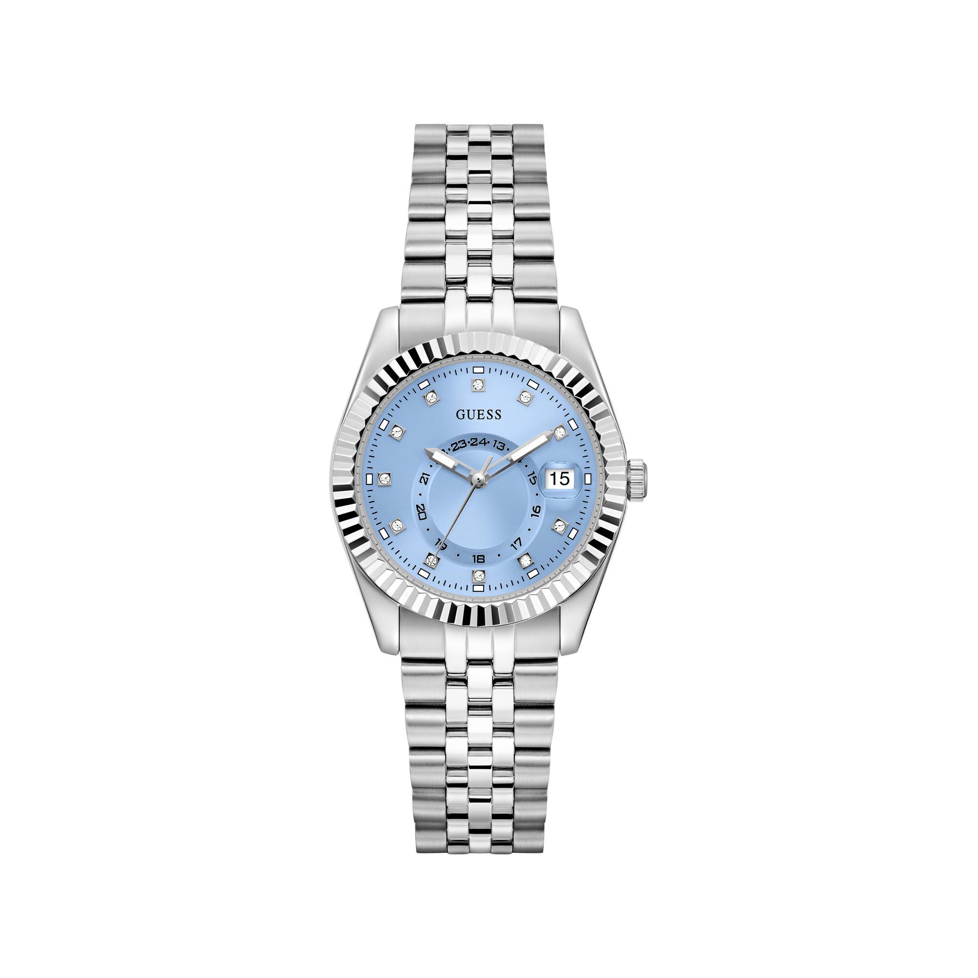 L'orologio da polso da donna Jada firmato Guess combina linee eleganti con accenti di cristallo scintillante e allo stesso tempo è sinonimo di un design sostenibile in acciaio inossidabile riciclato. Questo modello elegante combina un'estetica moderna con un artigianato responsabile. Cassa e cinturino in acciaio inossidabile riciclato Cristalli scintillanti come eleganti richiami visivi Lavorazione di alta qualità nel classico stile Guess