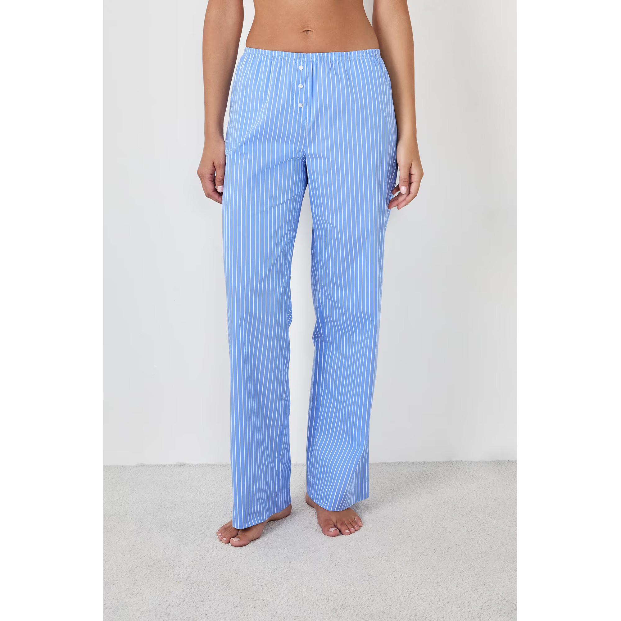 Questi pantaloni da pigiama presentano un classico motivo a righe, offrendo una vestibilità comoda e rilassata per il relax o il sonno. Il design include un elastico in vita per facilitare l'indosso e una chiusura con bottoni sul davanti.