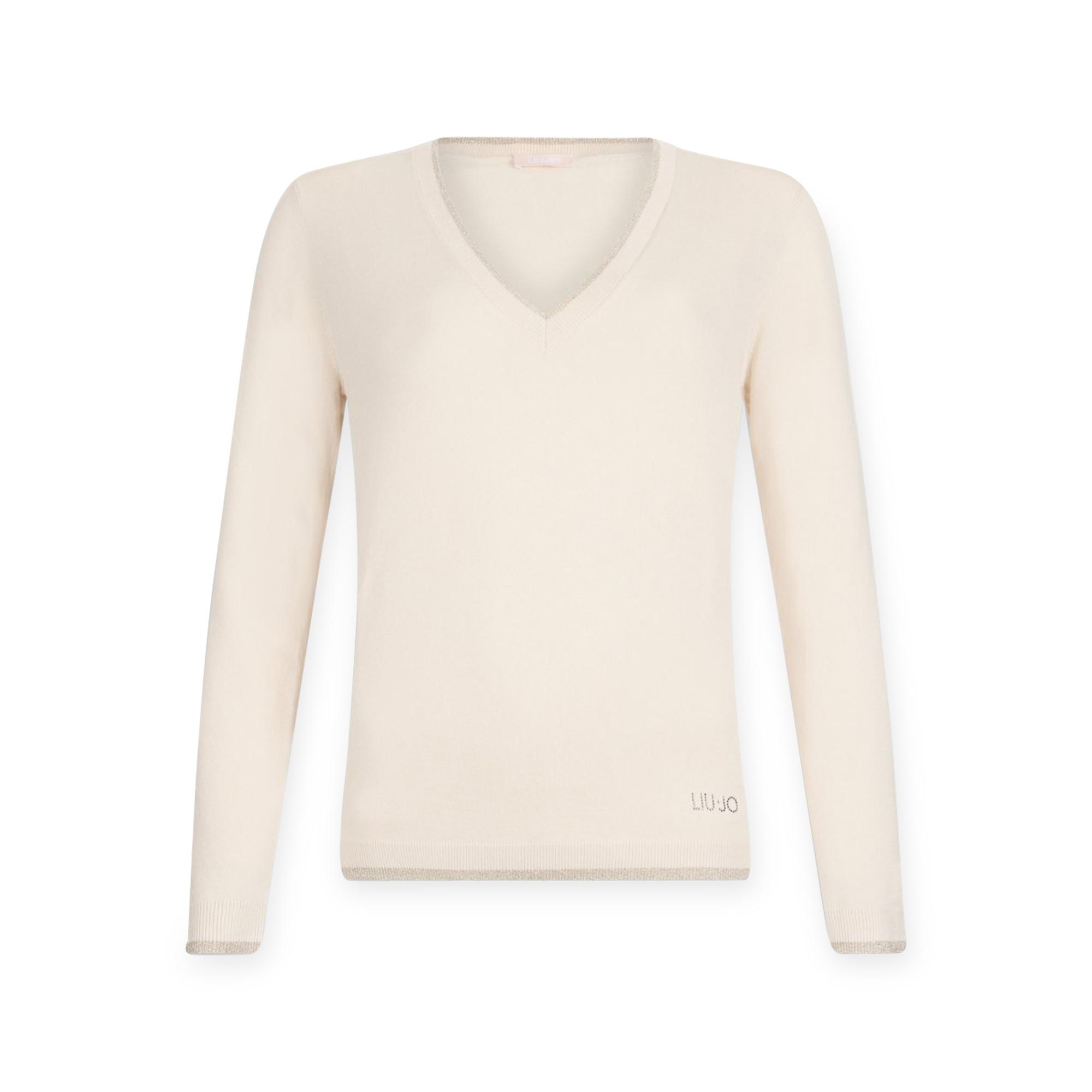 Questo pullover presenta un classico design a scollo a V, offrendo un'aggiunta versatile a qualsiasi guardaroba. Le maniche lunghe e i polsini a costine garantiscono una vestibilità confortevole, mentre i sottili dettagli metallici lungo lo scollo e l'orlo aggiungono un tocco di eleganza.