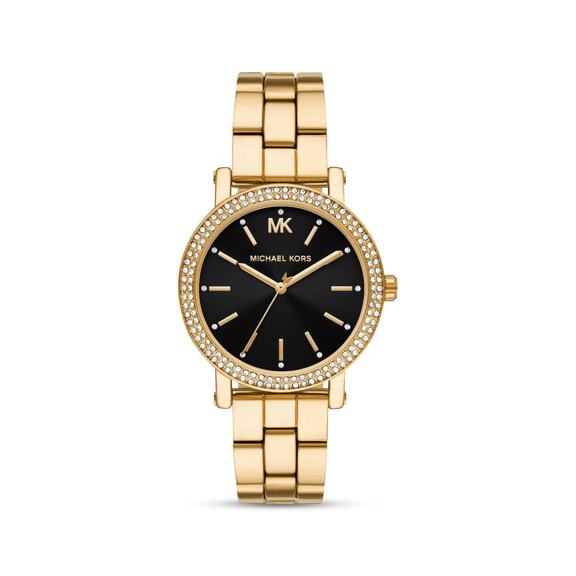 L’orologio Corey di Michael Kors eleva il tuo look quotidiano con un tocco di glamour, combinando stile classico e dettagli moderni. La cassa e il bracciale dorati, il quadrante nero effetto soleil e la lunetta impreziosita da pavé rendono l’orologio audace ma elegante.