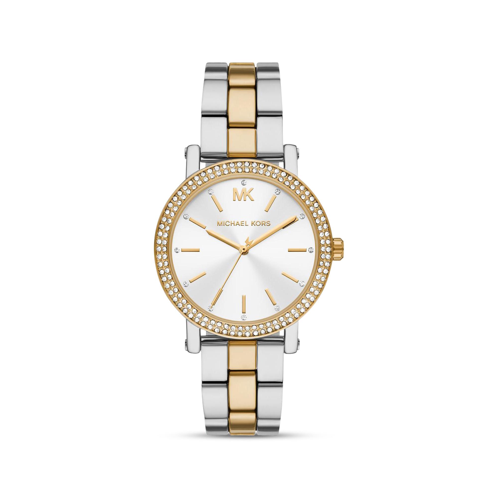 L’orologio Corey di Michael Kors eleva il tuo look quotidiano con un tocco di glamour, combinando stile classico e dettagli moderni. La cassa e il bracciale bicolore in oro e argento, il quadrante bianco effetto soleil e la lunetta impreziosita da pavé rendono l’orologio audace ma elegante.