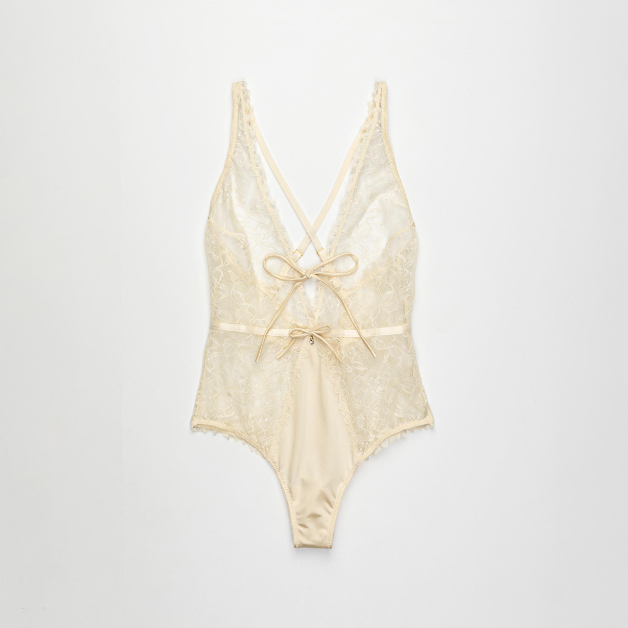 Questo elegante body presenta delicati dettagli in pizzo e raso, creando un look sofisticato e seducente. Il design include fiocchi decorativi sul davanti e un incrocio sulla schiena, aggiungendo un tocco di fascino e regolabilità.