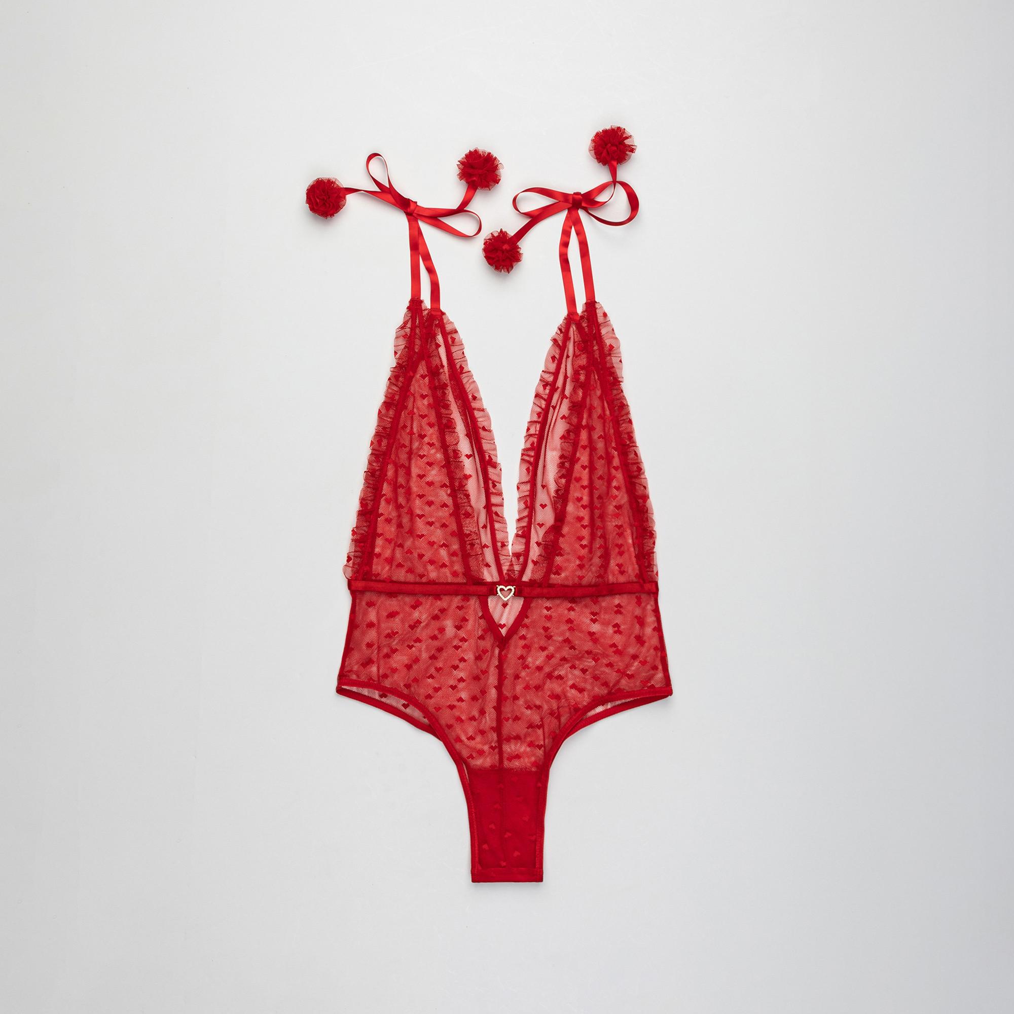 Questo body presenta una scollatura a V e coppe morbide, offrendo comfort e una silhouette delicata. Il design include dettagli in pizzo e una chiusura da annodare, aggiungendo un tocco di eleganza. Realizzato con una miscela di poliammide ed elastan, garantisce una vestibilità confortevole.