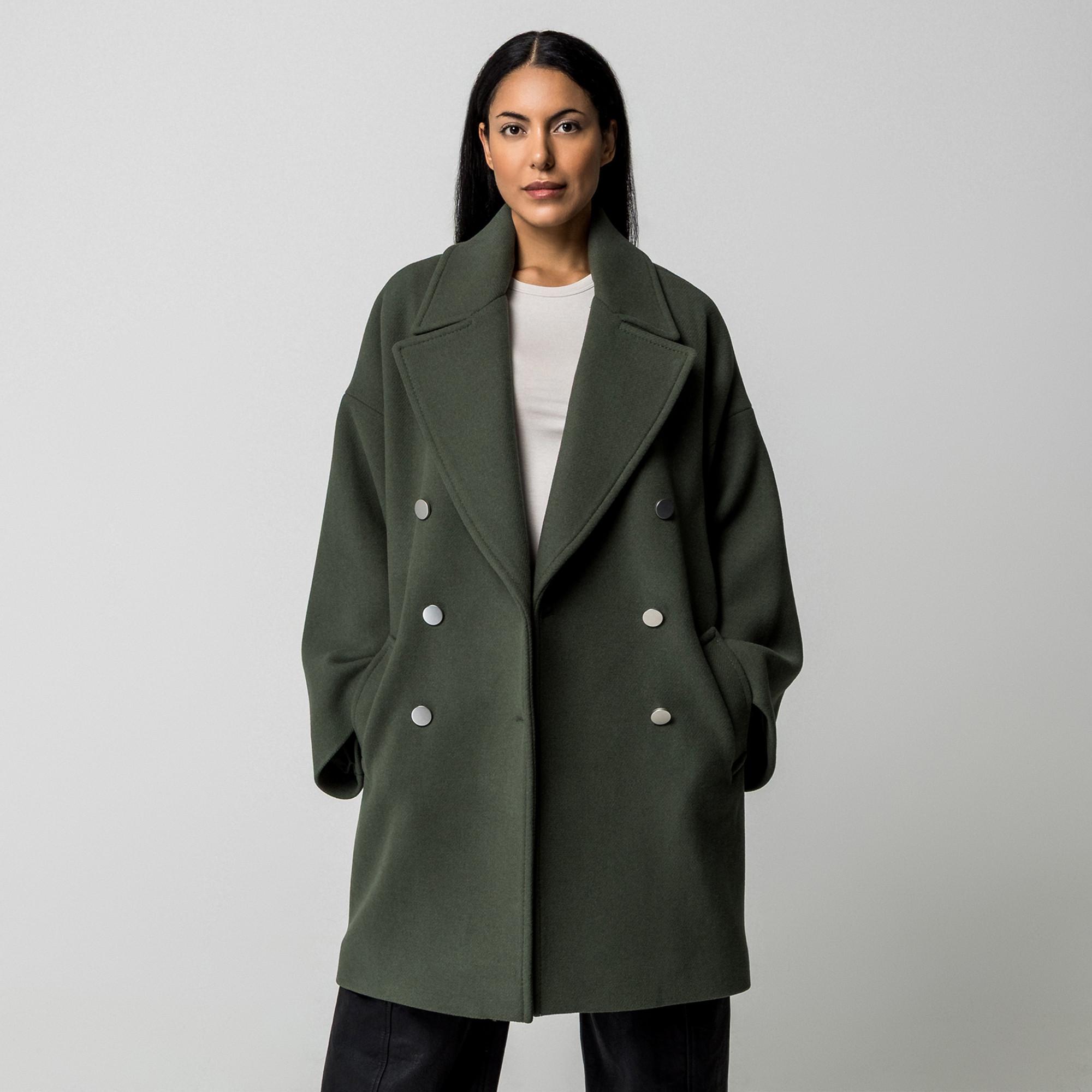Questo cappotto doppiopetto offre un look intramontabile e sofisticato. Il suo design classico presenta un ampio collo a revers e una vestibilità oversize, rendendolo un'aggiunta versatile a qualsiasi guardaroba. Il cappotto è progettato con pratiche tasche laterali per maggiore comodità.