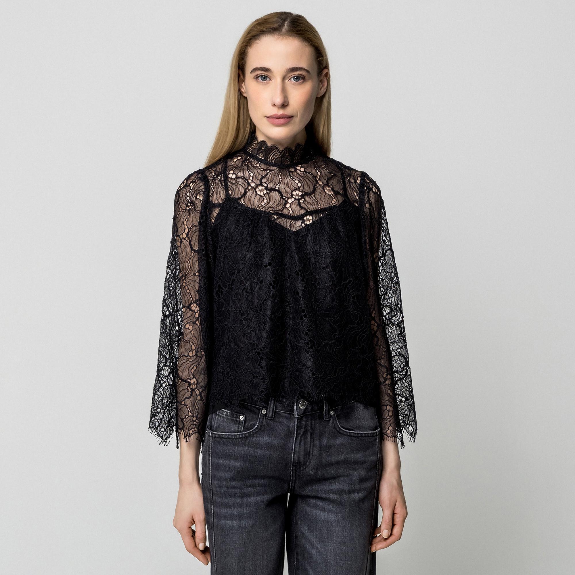 La blusa Lucia è corta e realizzata in pizzo delicato. Ha un colletto alto, maniche a tre quarti in pizzo e chiusura con due bottoni sul retro. Foderata e realizzata in poliestere 100 % riciclato – elegante e sostenibile.