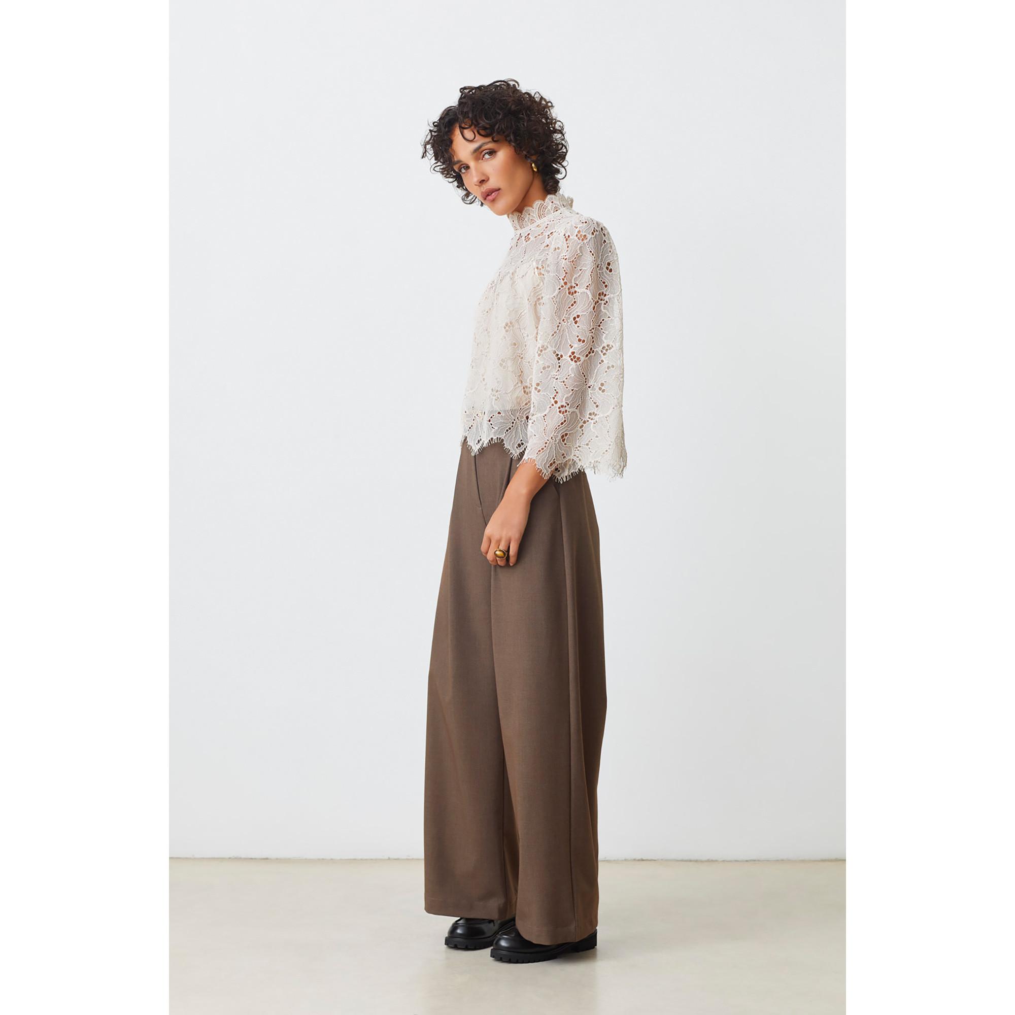 La blusa Lucia è corta e realizzata in pizzo delicato. Ha un colletto alto, maniche a tre quarti in pizzo e chiusura con due bottoni sul retro. Foderata e realizzata in poliestere 100 % riciclato – elegante e sostenibile.