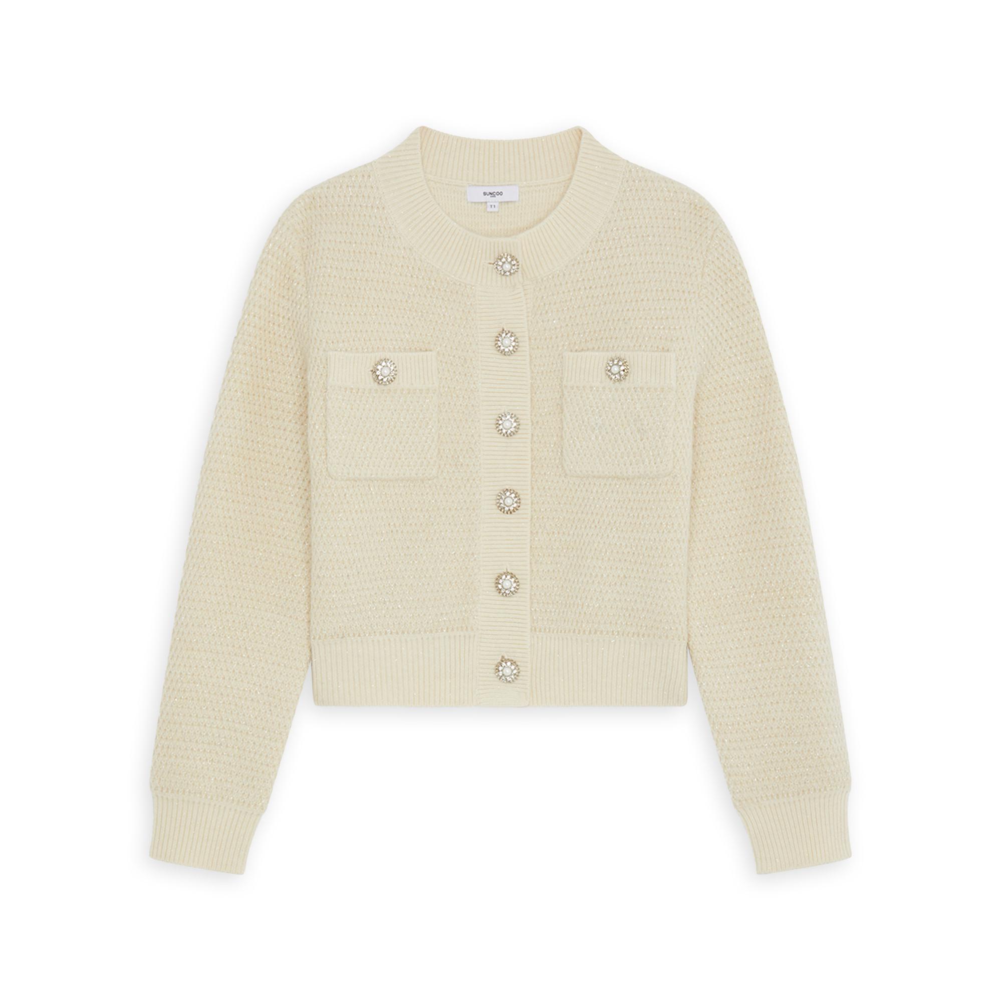 Il cardigan “Gabor” di Suncoo Paris colpisce per la maglia metallizzata e i bottoni gioiello decorativi. Due tasche applicate sul peto e le maniche lunghe completano il design raffinato. Realizzato con un mix di materiali di alta qualità e filato lurex.