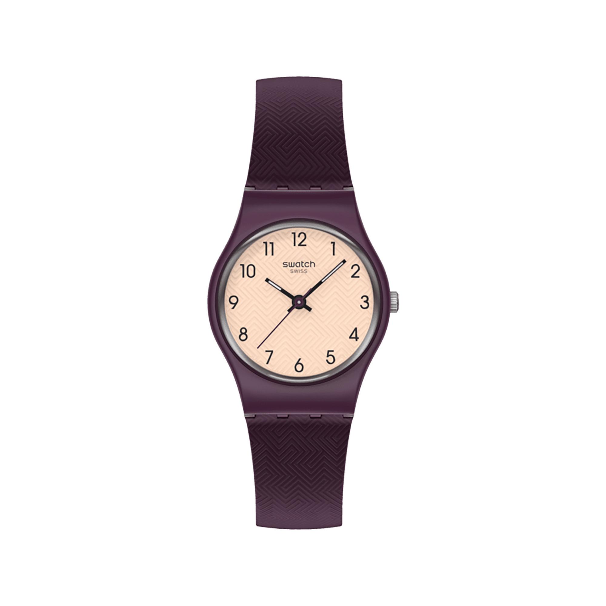 L'orologio affascina con un quadrante strutturato di colore beige, cifre nere e lancette luminose in una cassa viola scuro opaco. Un cinturino coordinato con passante e chiusura in viola scuro completa il look elegante. lancette luminose per una buona leggibilità elegante interazione di beige e viola scuro cinturino strutturato per uno stile moderno
