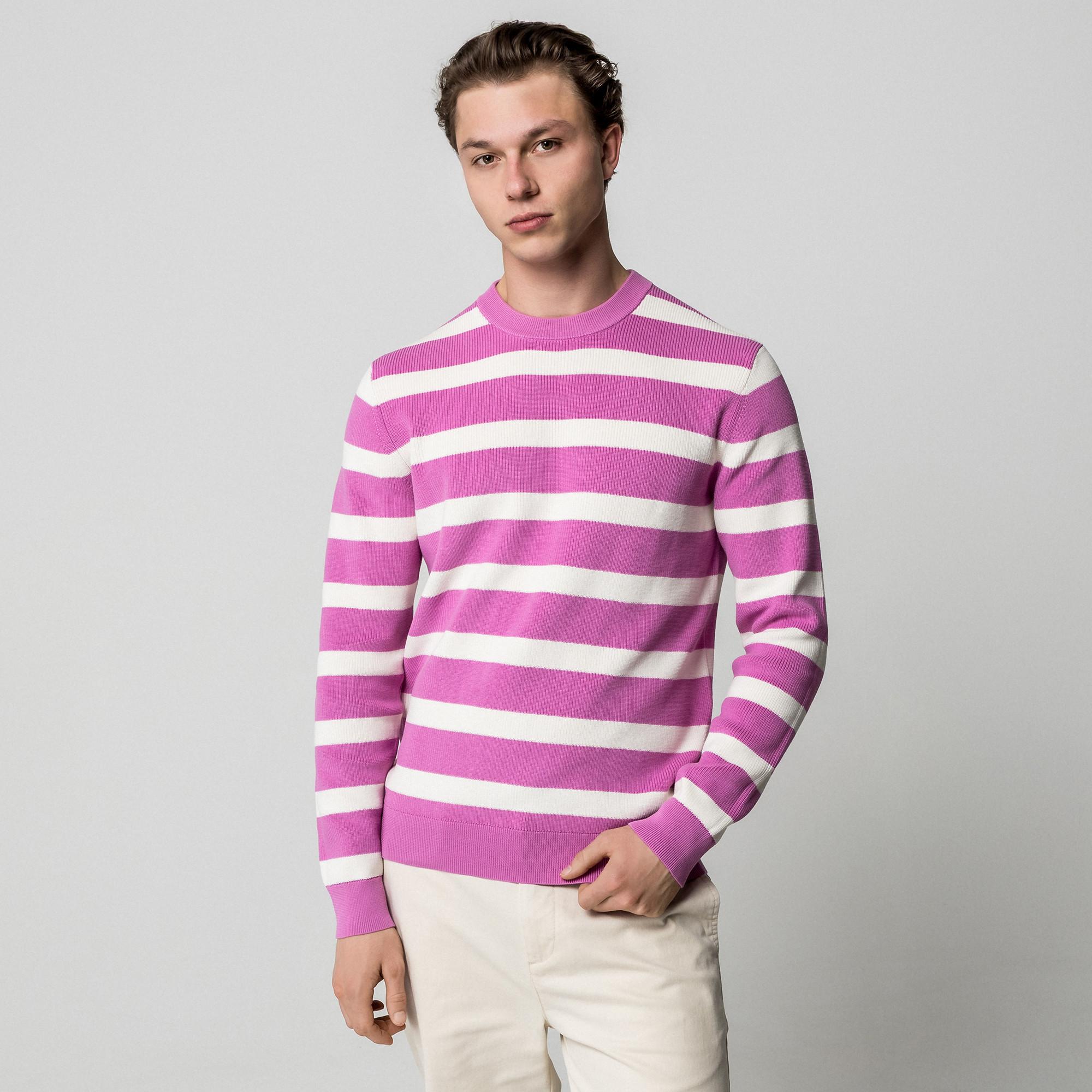 Questo maglione presenta un classico girocollo e un vivace motivo a righe, offrendo un look intramontabile ma alla moda. Il design include polsini e orlo a costine per una vestibilità comoda e una maggiore durata.
